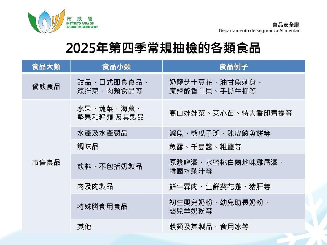 市政署将持续进行食品安全监督抽检及场所卫生巡查工作,一旦发现存有食安风险,将采取预防及控制措施,提醒食品经营者须遵守《食品安全法》及相关法例法规生产经营。二零二五年第四季食品安全监督常规抽检情况及二零二五年全年食品安全监督抽检工作总结均已上载至市政署食品安全资讯网 www.iam.gov.mo/foodsafety。