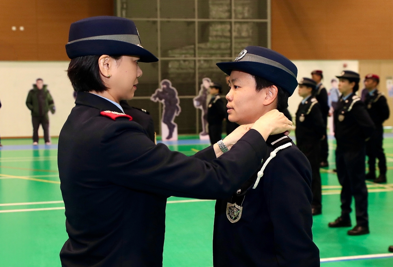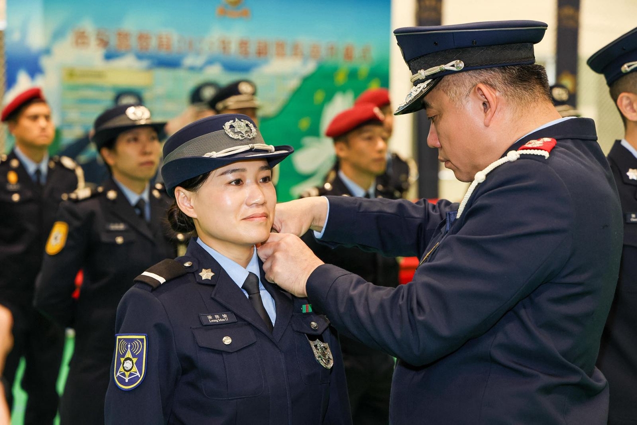 今(7)日上午,治安警察局在总部大楼举行副警长晋升仪式,仪式由伍素萍代局长主持,梁庆康副局长、郑俊禧代副局长及各部门主管出席仪式。仪式上,各位晋升的副警长正式戴上新的肩章,标志着晋升人员肩负起更大的责任和使命。