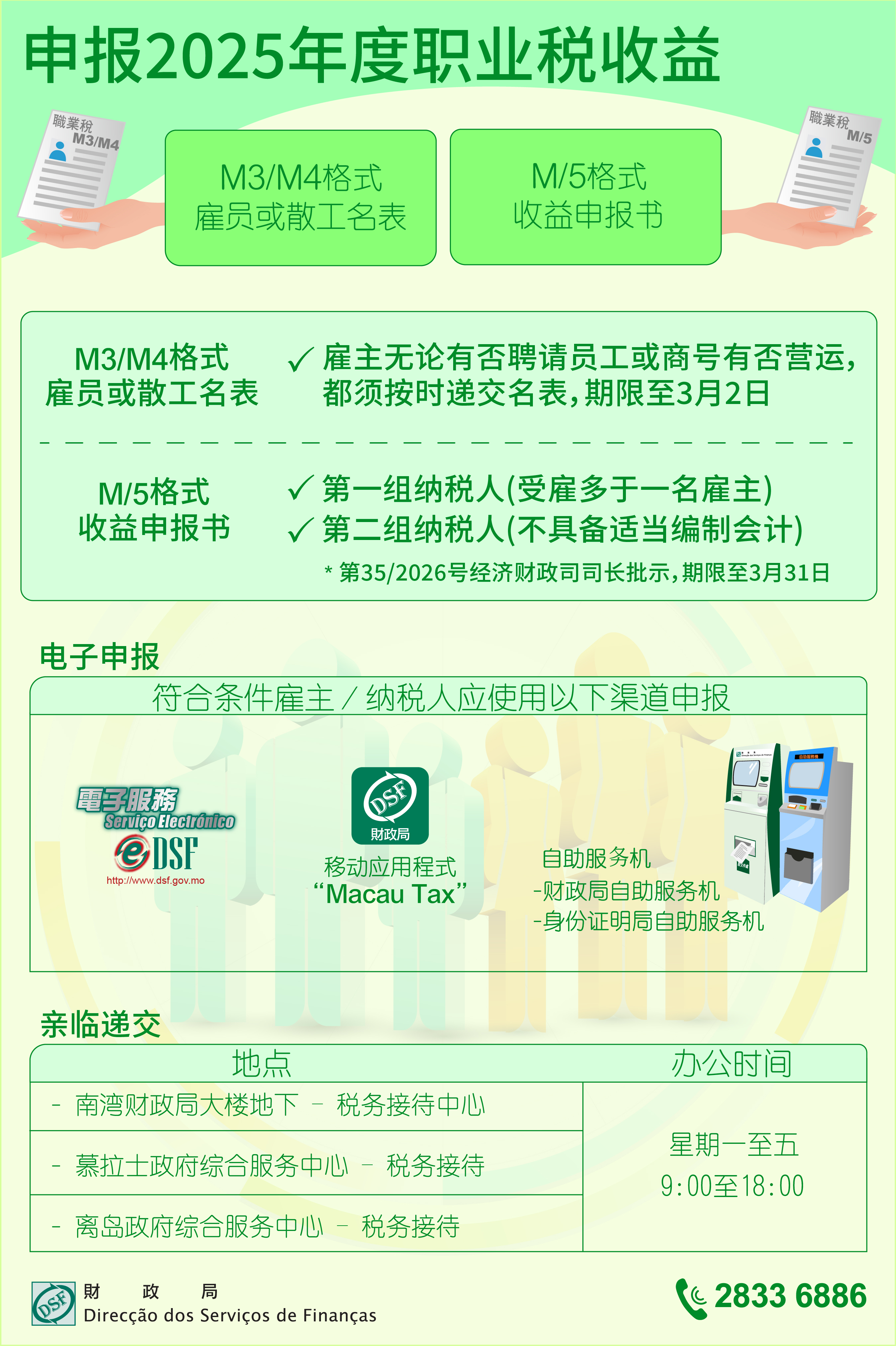 根据第2/78/M号法律核准之《职业税规章》第十三条之规定,2025年度职业税第一组M3/M4格式(僱员或散工名表)递交期限至3月2日;另根据第35/2026号经济财政司司长批示,倘收益从多于一位僱主处取得的职业税第一组纳税人,又或不具备适当编制会计的职业税第二组纳税人,递交2025年度职业税M/5格式收益申报书的期限至3月31日。