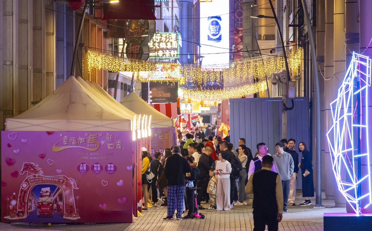 在新口岸广州街至北京街一带举办的“幸福加‘马’新口岸”,活动期至3月1日;街区以农历新年与情人节为主题,设置多组特色打卡装置,并安排精彩表演及互动游戏,同时联动区内商户推出联乘优惠,藉此展现社区节庆魅力。此外,旅游局亦资助多元社区活动,延续新春节日氛围。