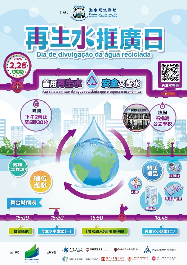 “再生水推广日”将于2月28日(周六)下午2时至5时30分在石排湾公立学校地面层举行。活动现场设有摊位游戏、工作坊、专题讲座以及咨询服务,还有广受学生欢迎的《威水超人》节水宣传剧上演。欢迎居民到场参与活动,完成指定项目更有机会获得精美纪念品。活动详情可浏览海事及水务局网站www.marine.gov.mo的“再生水专页”。