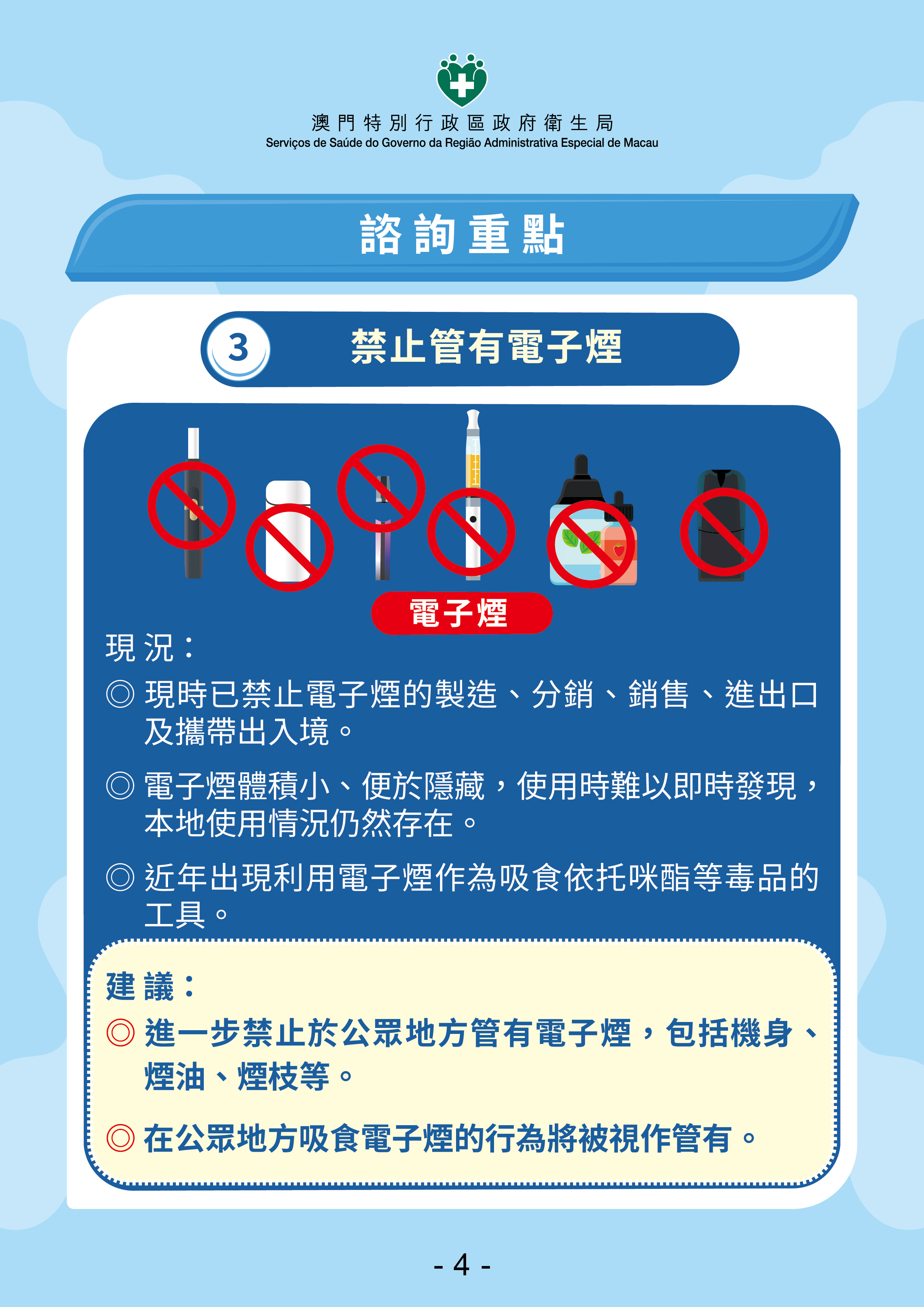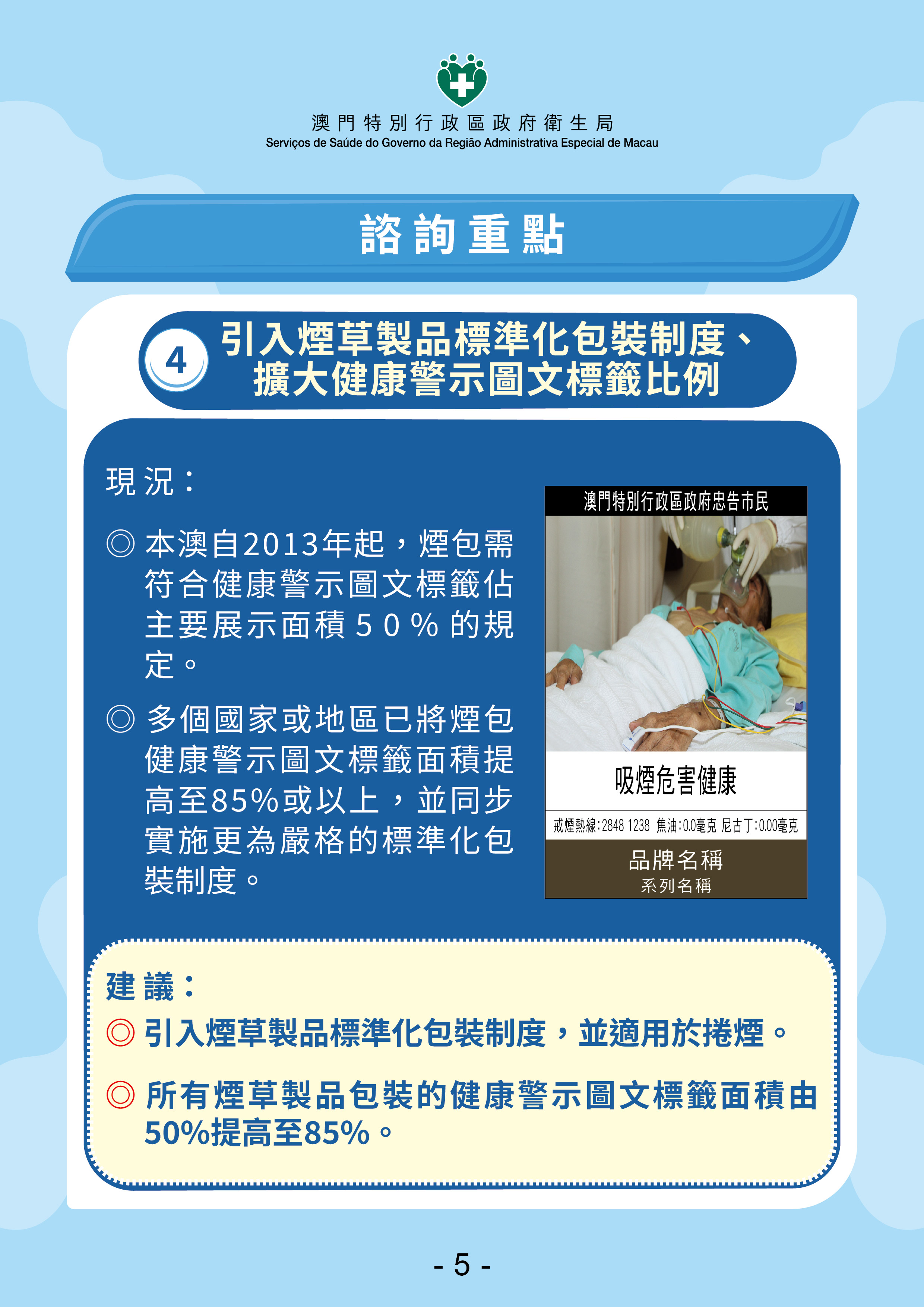 林松主任详细介绍了5项修法重点,包括:(1)针对“边行边吸烟”带来的二手烟问题,建议扩大室外禁烟范围,将学校、托儿所等场所出入口列为法定禁烟地点,并允许政府在听取社会意见后在部分人流密集的街道、广场设立“禁烟区域”;(2)为防止青少年接触新兴烟草产品,建议禁止尼古丁袋、草本烟及水烟(包括水烟烟草/水烟膏、水烟壶)制造和流通;(3)虽然特区政府已禁止电子烟的制造、分销、销售、进出口及携带出入境超过三年,但在社会上仍不时发现吸食或偷运的情况。为进一步加强管控,建议禁止在公众地方管有电子烟;(4)为减低烟草包装对吸烟者特别是年轻人士的吸引力,建议引入烟草制品标准化包装制度,并扩大健康警示图文标签在包装上的比例;(5)为保障巡查时卫生局监察人员的人身安全并提升执法效率,建议允许前线人员在执行职务时配备可携式摄录设备,以便在发生冲突时作出记录以辅助取证及记录过程。