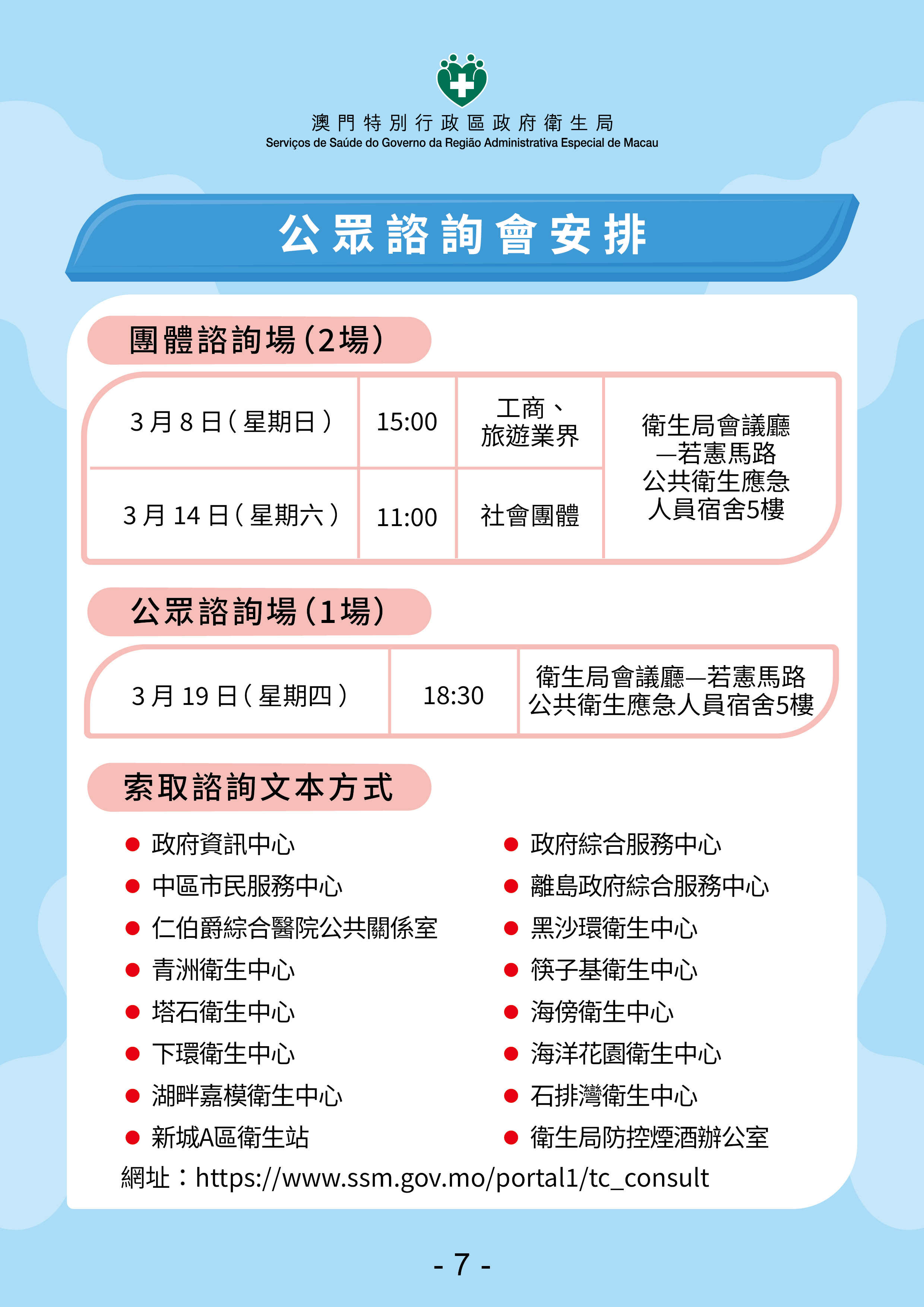 此外,将于3月8日至4月8日在卫生局公共卫生应急人员宿舍5楼会议厅(澳门若宪马路350号)举行3场公众咨询会,具体安排如下: