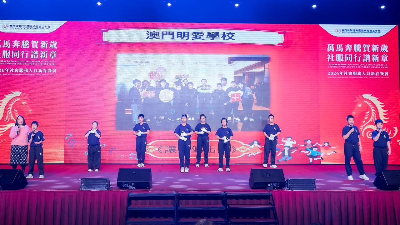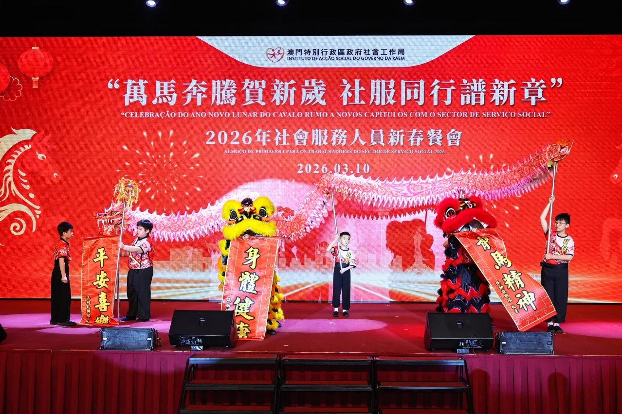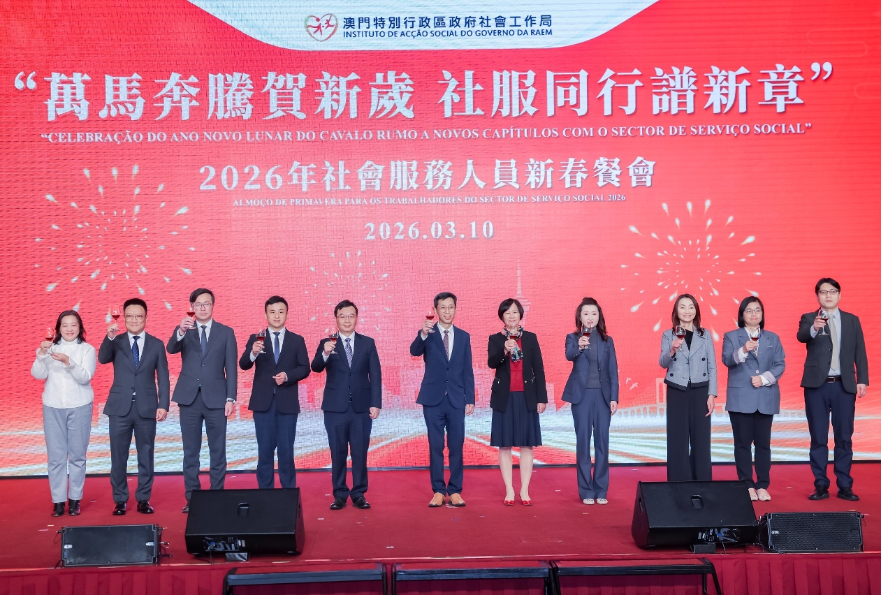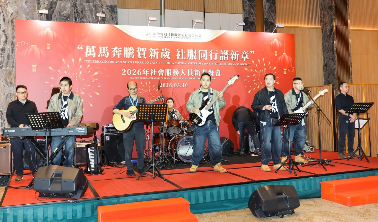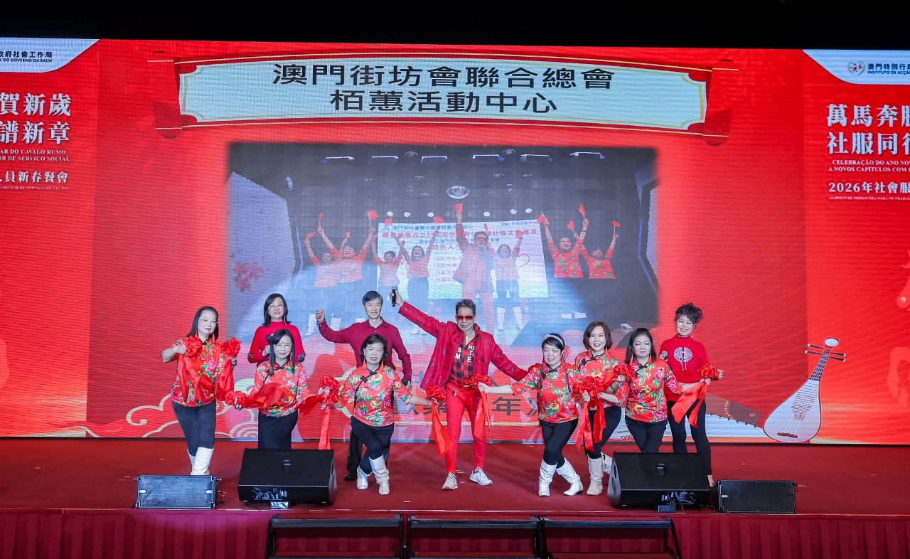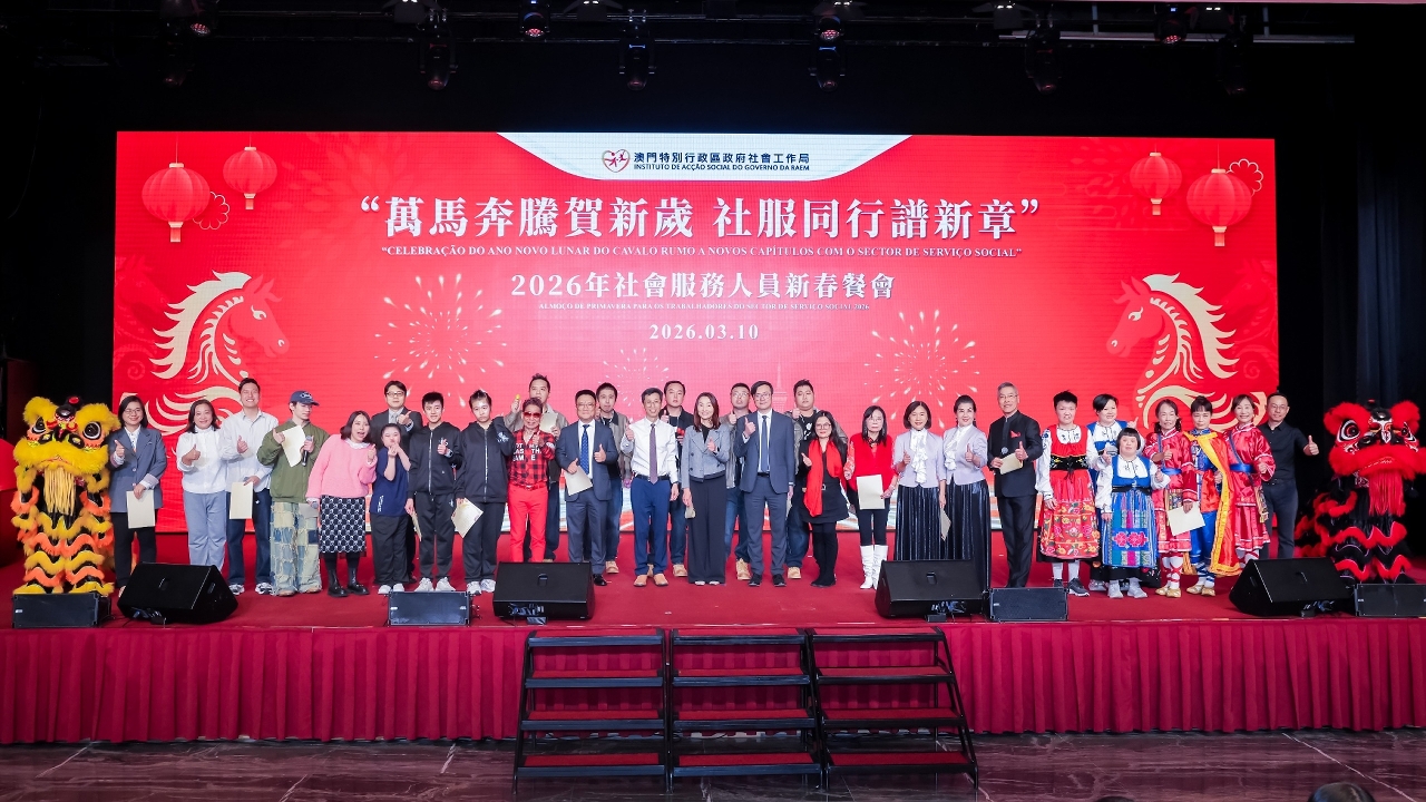 社会工作局于3月10日在澳门渔人码头会议展览中心举行“万马奔腾贺新岁  社服同行谱新章”2026年社会服务人员新春餐会,来自涵盖青少年、家庭、复康、长者及社区服务等不同服务领域的机构代表,以及政府部门代表等约700人聚首一堂,共庆新春。餐会邀请多个社服团体演出,展现多元才华与潜能,由不同机构的服务使用者和社会工作局同仁跨界别合作,呈献了温馨又具感染力的表演,充分展现了业界多元一心的精神;舞台下社会服务机构代表及社会各界人士热情交流,气氛融洽,共同建构一个互助共融的平台。