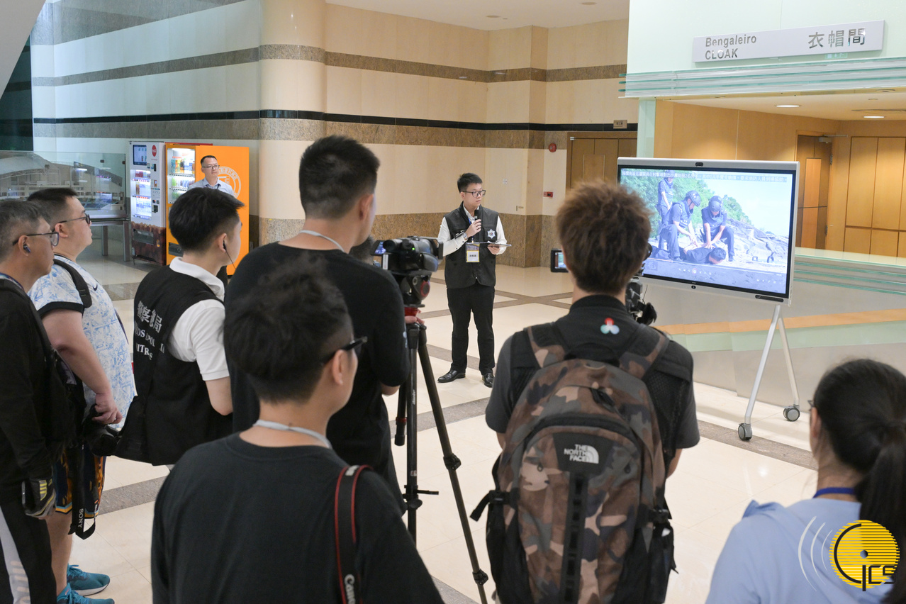 2024年大型聯合反恐演練“盤龍" - 警察總局局長助理梁文照和中國人民解放軍駐澳門部隊副參謀長劉歡向傳媒介紹演練流程及相關安排。