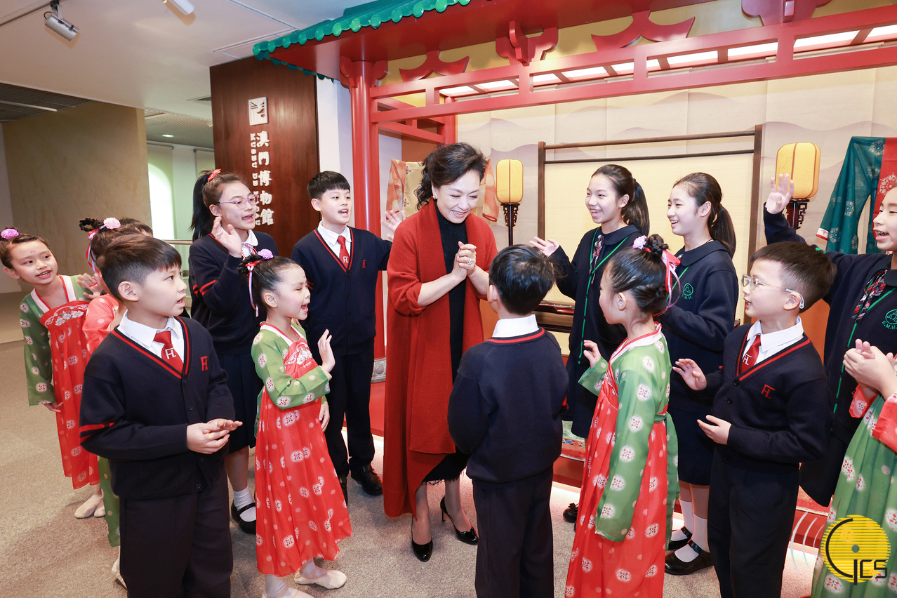 12月19日上午,國家主席習近平夫人彭麗媛在澳門特別行政區行政長官賀一誠夫人鄭素貞陪同下,來到澳門博物館參觀。這是在博物館三層大堂,彭麗媛和剛剛參觀完展覽的小朋友們交流參觀感受。(新華社圖片)