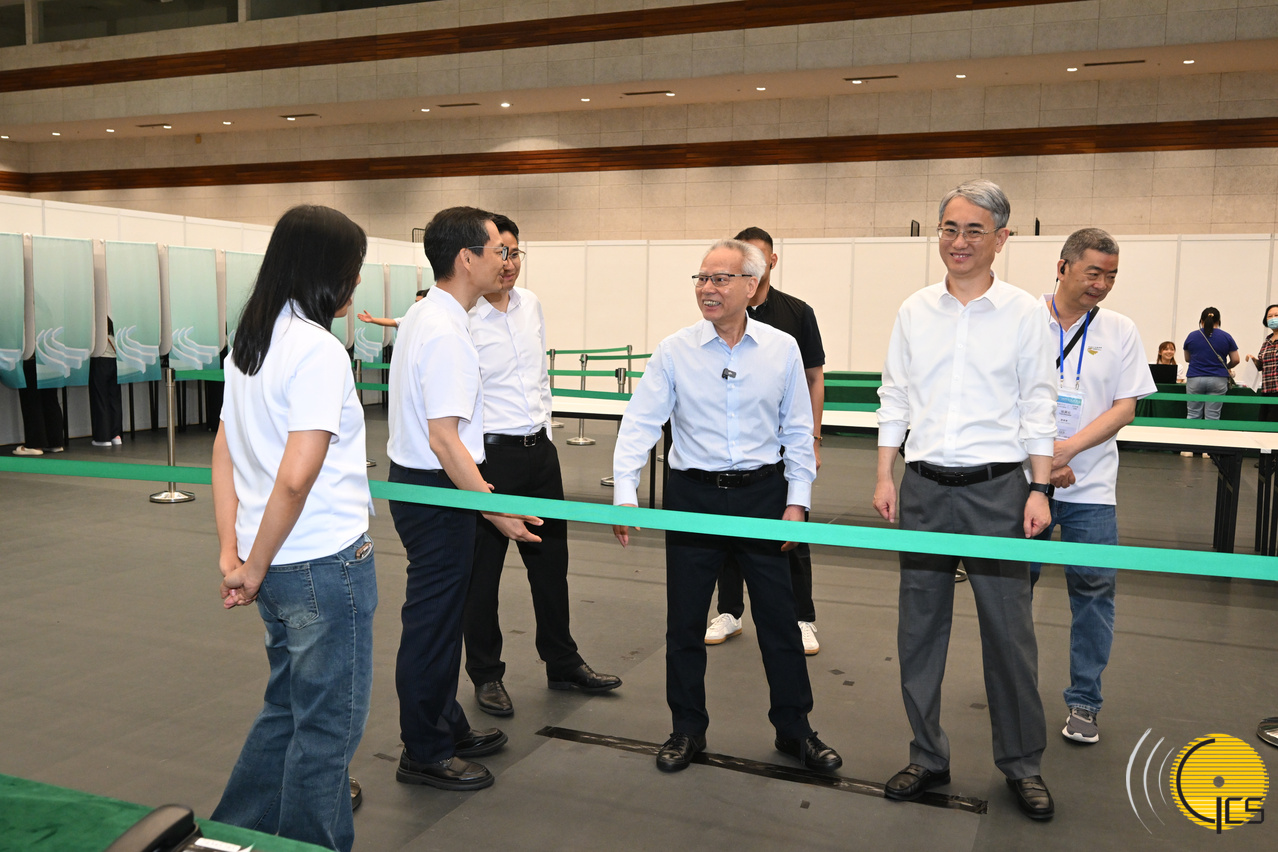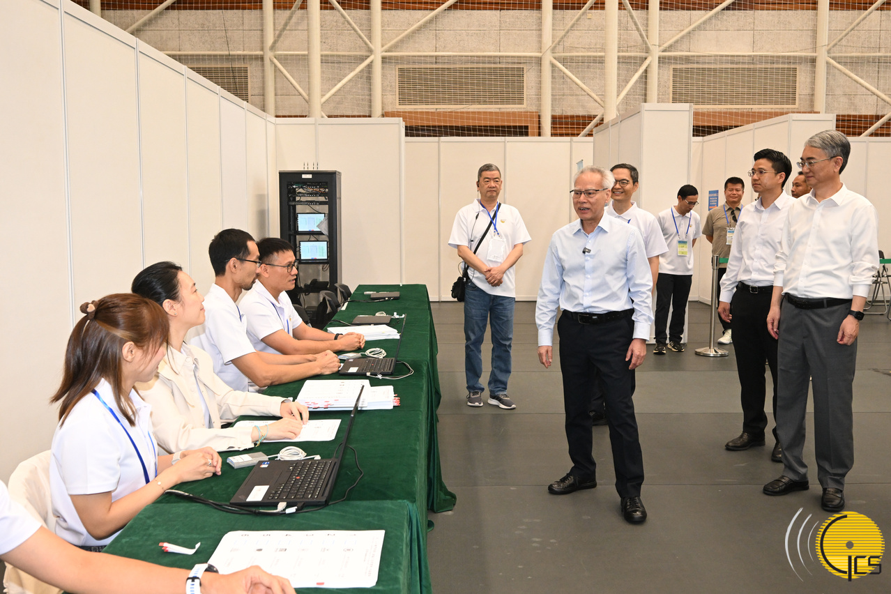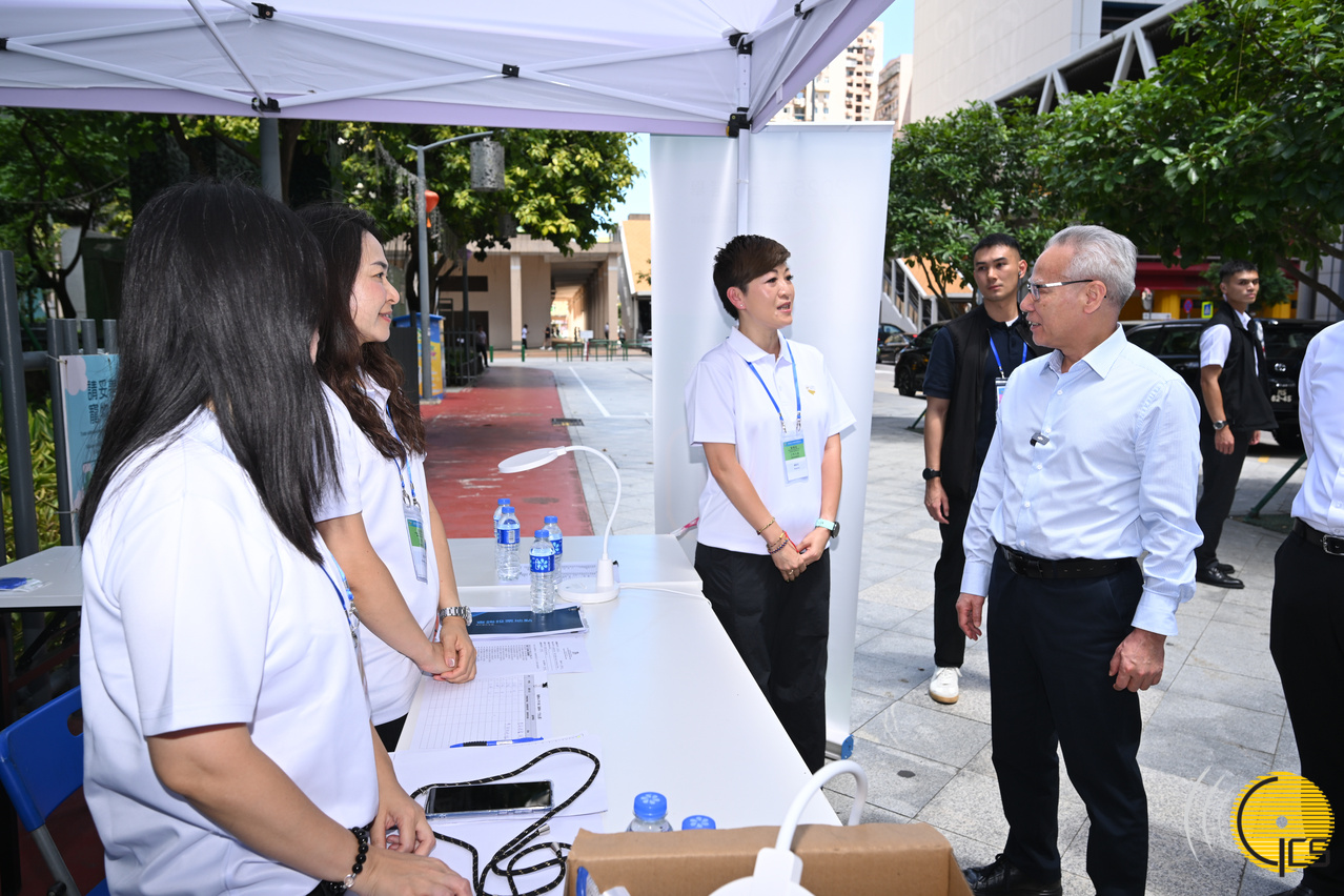 2025立法會選舉:行政長官岑浩輝中午約12時20分到氹仔運動場投票站視察,並到投票站外的候車點及設在中央公園的服務站,為工作人員打氣加油。