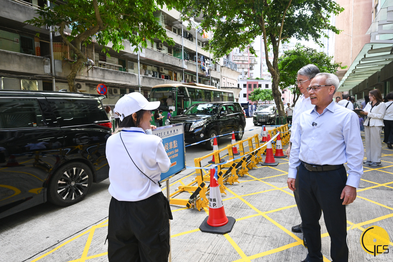 行政長官岑浩輝在化地瑪聖母女子學校票站外關心工作人員情況。
