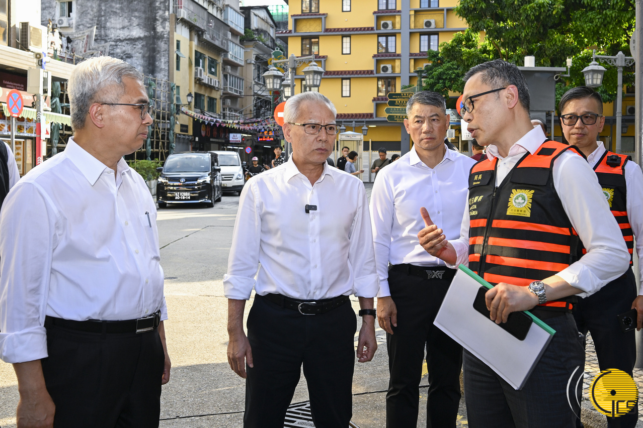 行政長官岑浩輝在保安司司長黃少澤及警察總局局長梁文昌陪同下,到十月初五街一帶視察,關心商户及居民應對颱風的準備情況。