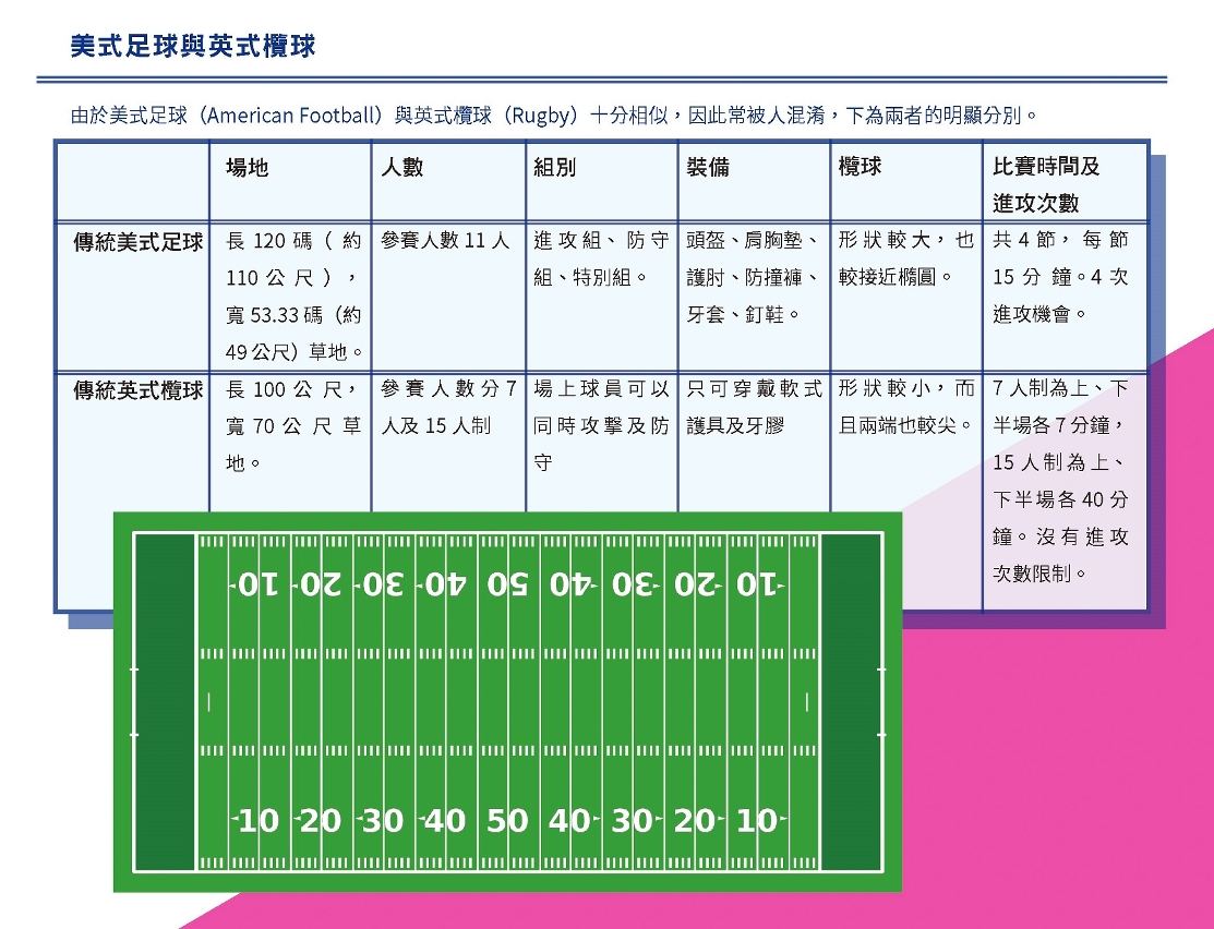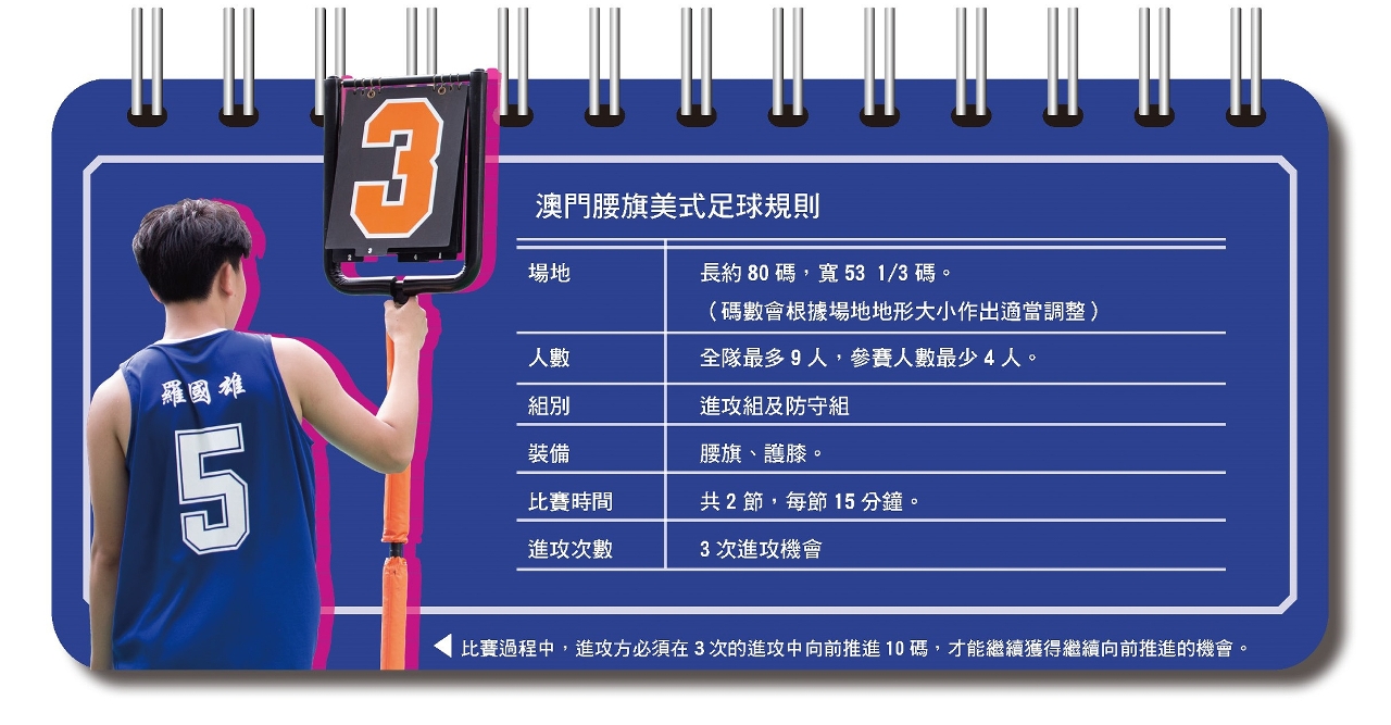 傳統美式足球需要在一個長120碼,寬53.33碼的草坪球場上進行。澳門由於場地的局限,只好因地制宜發展腰旗美式足球。方登慧介紹,腰旗美式足球是從傳統美式足球簡化而來的大眾化運動,兩者規則與技巧相似,主要供當地的青少年參與。「與傳統美式足球相比,腰旗美式足球的衝撞較少,規則亦相對簡單。為了更易於在青少年間進行推廣,我們還根據澳門的場地大小,對比賽規則作出適當的調整。」