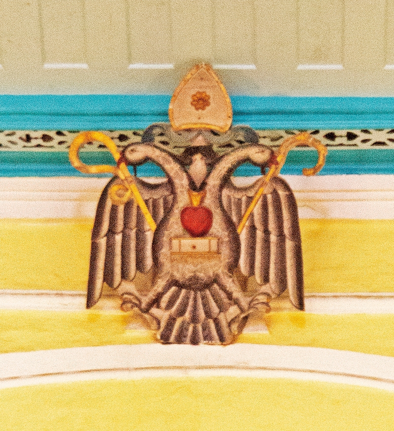 教堂中廳與主祭室之間的大圓拱上方,有一個帶雙頭鷹的徽章,是奧斯定會的會徽。順便一提,市政署大樓地面層入口大廳的牆壁上,也鑲嵌着兩塊刻有奧斯定會徽的石刻,其上刻有雙頭鷹、聖經、插着箭並帶火焰的心,象徵該修會的格言:「一心一意向天主(Anima una e cor unum in Deum)」。該兩石刻是從已拆的建築中收集移放於此的。