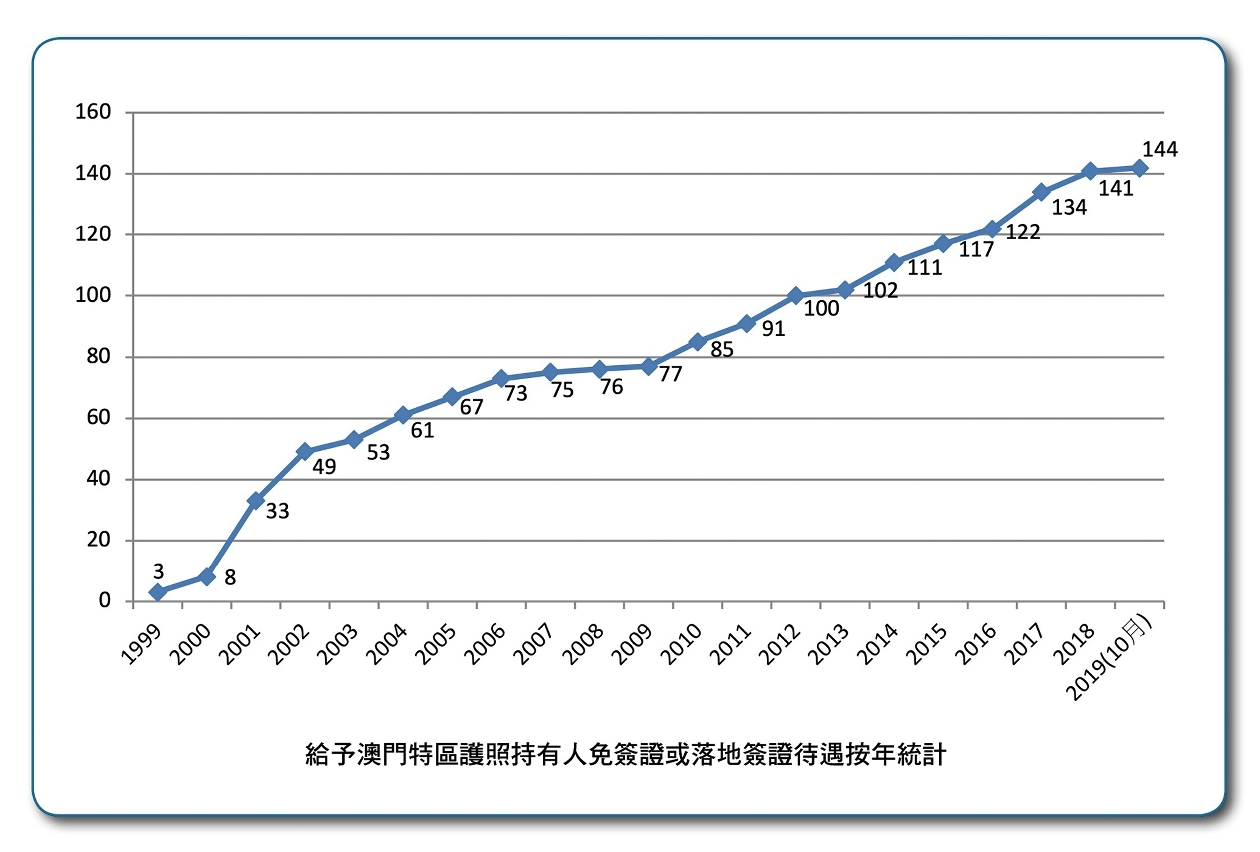 澳門回歸祖國以來,特區政府一直不遺餘力為居民爭取更多的旅遊便利。身份證明局副局長黃寶瑩稱:「澳門在回歸初期,只有3個國家給予澳門特區護照持有人免簽證入境,在中華人民共和國外交部(下稱「外交部」)和中華人民共和國外交部駐澳門特別行政區特派員公署(下稱「外交公署」)的支持和協助下,現在已有144個國家和地區給予特區護照持有人免簽證或落地簽證的待遇,亦有13個國家和地區給予特區旅行證持有人相同待遇,且兩證的免簽國或落地簽國數目每年都有所增加。」