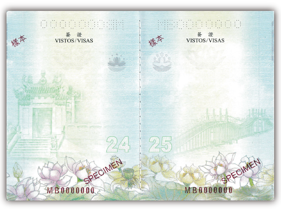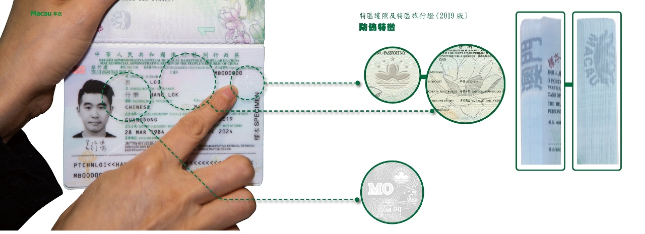 凹凸防偽圖案:澳門特區區徽、蓮花圖案及「PASSPORT」 (在護照上)或「TRAVEL PERMIT」(在旅行證上)字樣具有凹凸手感。