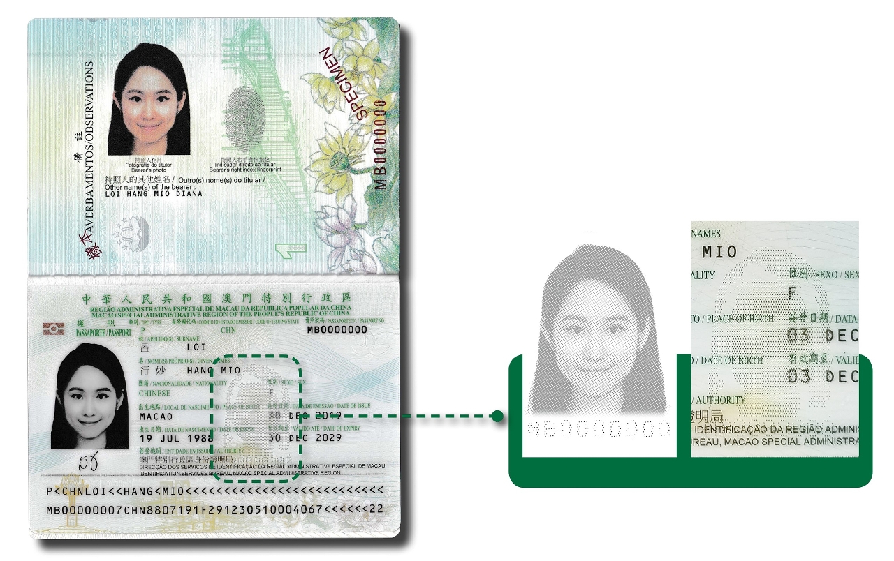 鐳射穿孔技術:持證人的相片以鐳射穿孔技術射印於資料頁上,鐳射穿孔圖像下為持證人的旅行證件號碼。
