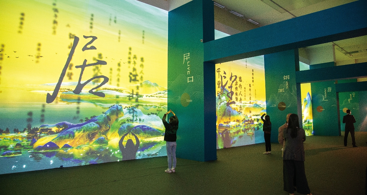 走進展場,迎面的便是充滿活力與震撼,以《千里江山圖》的山勢為靈感而設計的「千里江山圖3.0」主展板,全長35米,高6米,大小是原畫的30餘倍。其中涉及的場景包含166組山體、800多艘船隻和500多個人物及動物。由100多位工作人員,歷經半年時間完成。