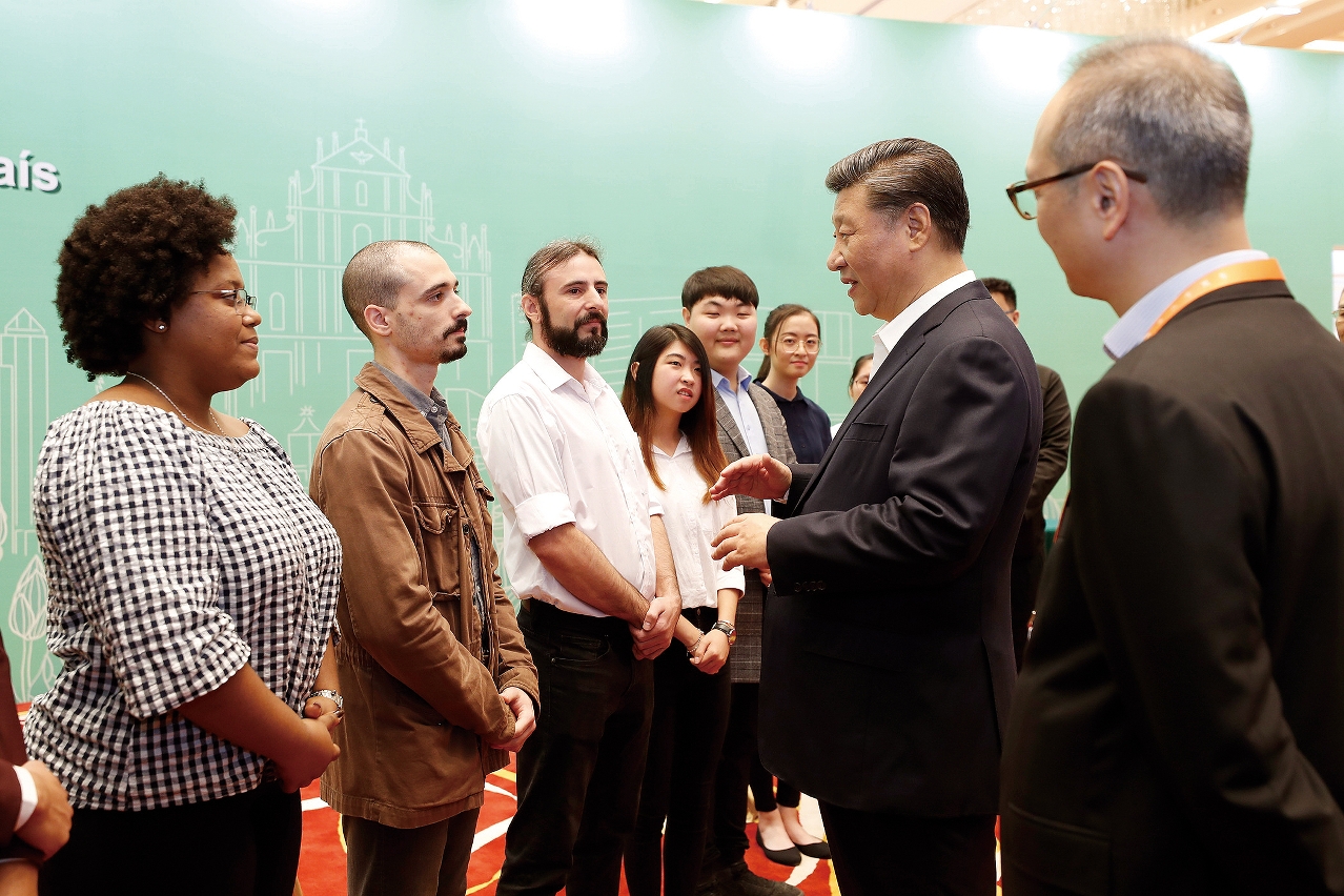 其後,習近平主席與來自馬來西亞、韓國、佛得角、巴西、葡萄牙的11名留學生以普通話交流,關心學生在澳門學習的情況,期望他們在澳門學習生活愉快及順利,以及未來能學有所用。