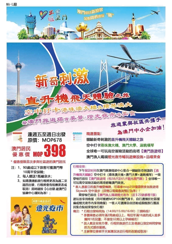 自7月15日實施粵澳兩地人員正常往來措施後,澳門各口岸出入境人數持續增加。胡景光說,在解除入境限制措施後,第一步會到大灣區城市推廣本地遊,再逐步拓展到整個廣東省。根據市場分析,大灣區旅客的取向與澳門居民相似,澳門本地遊路線對大灣區遊客有一定吸引力。「就今次項目得出的數據顯示,多數市民都偏愛放鬆心情的郊野之旅,業界可嘗試將一些較熱門的景點,整合成全新路線,再向市民及內地遊客推廣,對澳門旅遊業的發展具參考意義。」