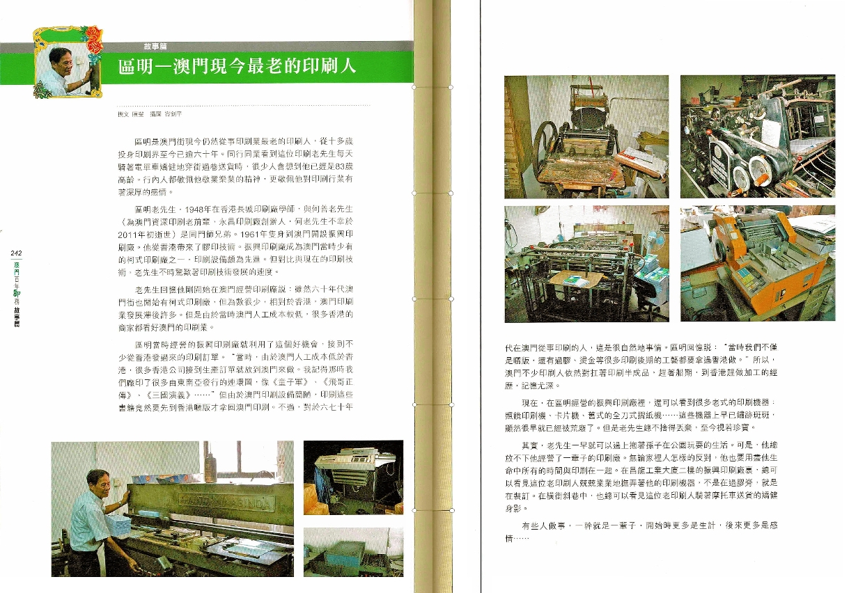 翻閱這本書,一段段屬於澳門印刷業者的奮鬥故事躍然紙上,令人驚嘆於他們對印刷的熱情和貢獻。未來,繼承着這班老前輩衣缽的年輕人,相信都會堅守上一代人敬業樂業的精神,把歷史繼續書寫下去。