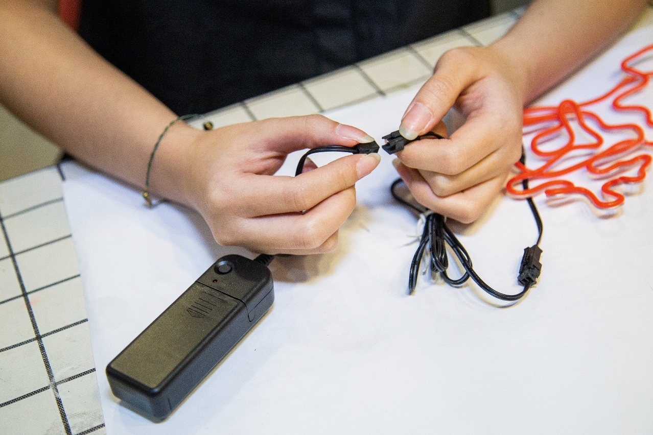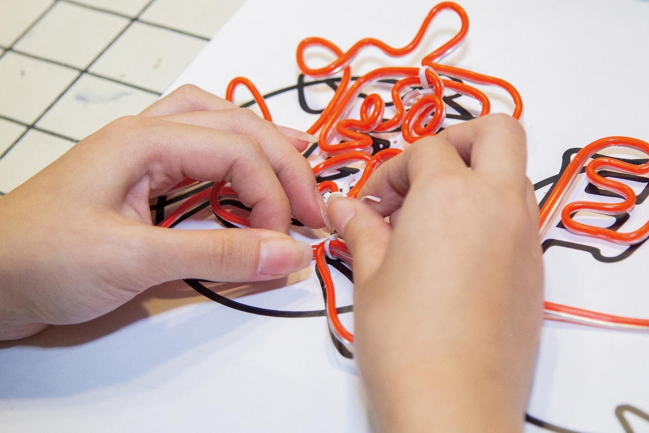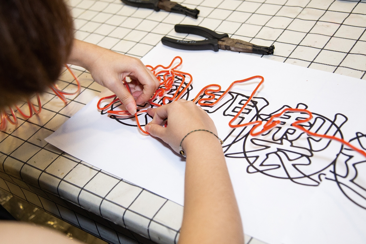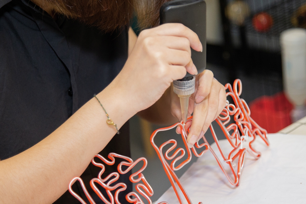 相比起製作傳統霓虹招牌要加熱彎曲玻璃管、連接電極,再清除玻璃管內雜質、排出空氣並添加氣體等等專業工序,冷光燈牌的製法門檻較低,但Ruby指出,要把成品做得好看,仍須花上不少心思:「在製作燈牌前,需要先打印設計圖,再用線照着圖紙繞出造型,較為特別的是,冷光燈牌須『一氣呵成』,即用一條線完成整個圖案或字樣。因此,在整個製作過程中,要不斷思考如何用線把分離部份自然地串連起來,這十分考驗製作者的動手能力、美感、排線佈局的技巧。」除了繞線,冷光燈還須經鐵線固定、UV膠黏合等程序,完成一個尺寸約為30厘米的招牌,往往需要2至3小時。雖然耗時良久,但帶着滿滿心意製作出來的手作品,比起量產商品,更多添一份温暖。她說:「參加課程的學員,涵蓋不同年齡和性別,是一項任何人士都能參與的手作活動。」