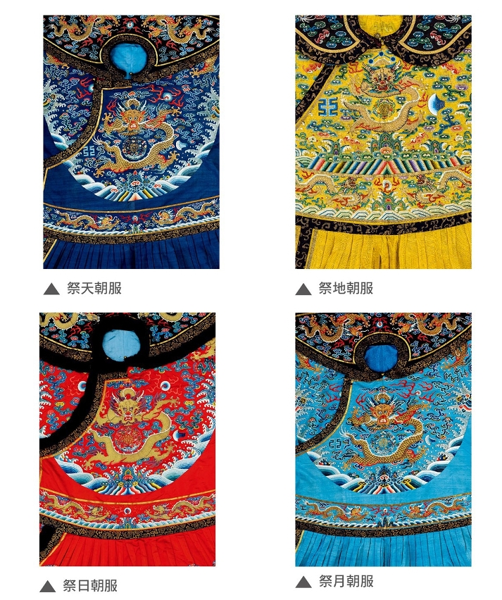 故宮博物院宮廷部織繡文物組副研究館員章新介紹,色彩是文物承載的重要文化歷史內容,宮廷服裝顏色既承襲了中原王朝正統,又保存了騎射民族的本色。清代祭祀禮制對服裝色彩有嚴格規定,皇帝在祭天時穿藍色朝服(禮服中的一種),祭月時穿月白色朝服,祭日時穿紅色朝服,祭地時穿明黃色朝服。