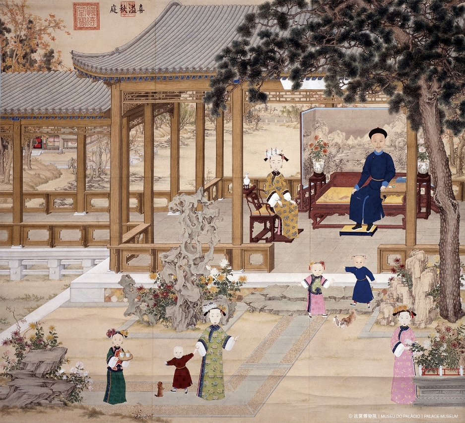章新以《喜溢秋庭圖》為例,闡述清代宮廷服裝顏色的發展源流。《喜溢秋庭圖》是一幅描繪道光帝闔家庭園賞秋的畫作,描畫了時年52歲的道光帝、26歲的孝全皇貴妃以及年幼的四阿哥奕詝(即咸豐帝)、六阿哥奕訢(即恭親王)等人的相貌體態,而且準確地描畫出不同身份的人,在日居生活中的穿衣打扮、服飾佩戴等,體現了色彩體系與政治權力的緊密關聯。