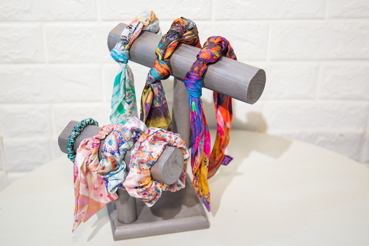 走進Stardust Journey店,室內裝潢以藍色為基調,擁有寬闊挑高的空間感,牆上掛着多幅鑲框的絲巾作品,不論裝潢還是店內擺設都相當有風格。店舖中間以一塊大型掛簾分隔為兩個空間,前面的空間用作產品展示及銷售,後面則是安志穎進行創作及舉辦工作坊的地方,可容納6至8人。