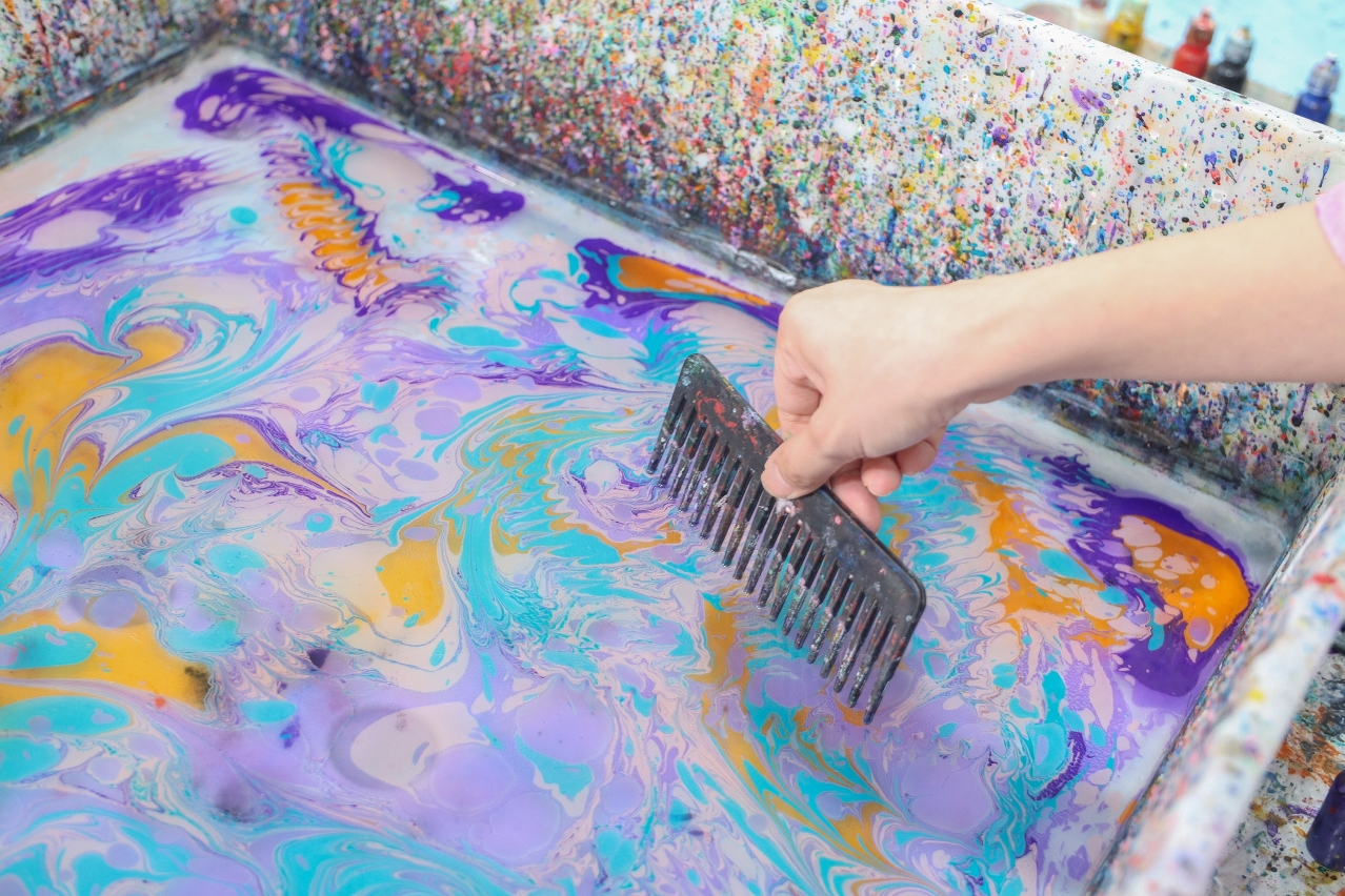 她詳細解釋,土耳其浮水畫是以水為「紙」,即在水上作畫。首先要調配出浮水畫的水膠液,即在水中加入如海藻粉等黏性粉類,靜置12小時,使其充份完成化學反應,水和顏料就會分層;再使用水溶性顏料滴入水膠液上,顏料隨着水波自然擴散。此時,可運用畫筆沾染顏料,星星點點撒在水上,再用畫錐等工具,在水面上勾畫出喜歡的形狀;最後,就是拓印的部份,將畫紙擺平覆蓋在水上,吸取顏料,然後再將畫紙慢慢抽離水面,形成畫作。「浮水畫的載體十分豐富,只要能夠吸水的物件都能拓印花紋,包括絲巾、皮具、布料等。」