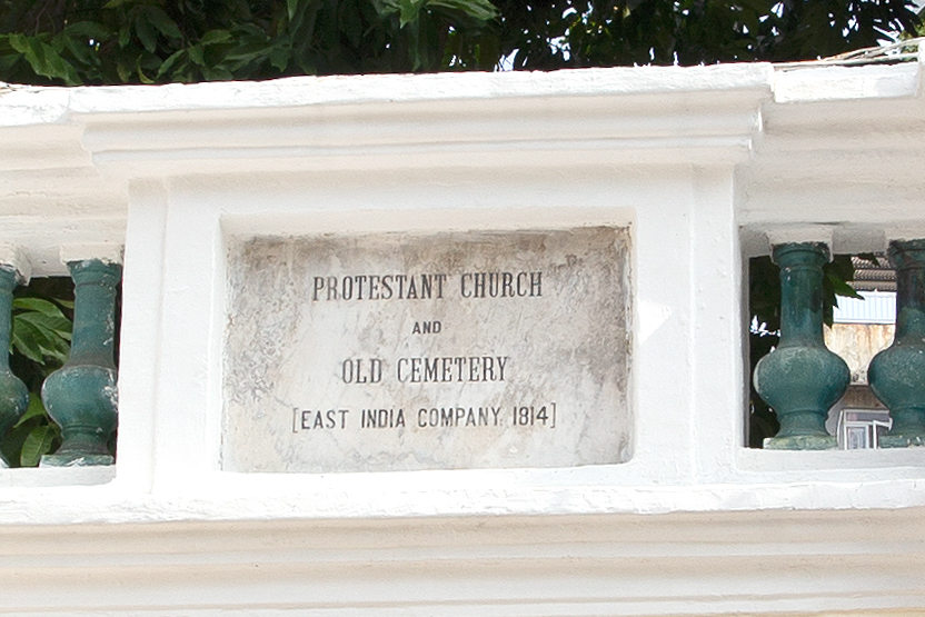 墓園入口的石碑,寫着「基督教教堂及舊墳場,東印度公司1814」。這裡1814的年份與購買土地開闢墓園及建立教堂無關,1814年是東印度公司取得專利證,以其在印度的收益來獲取和維護教會財產的年份。而該門上的石碑是1858年墓園關閉後,在當時城外的望廈開闢新墳場之後才加設。