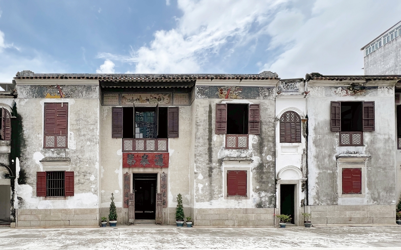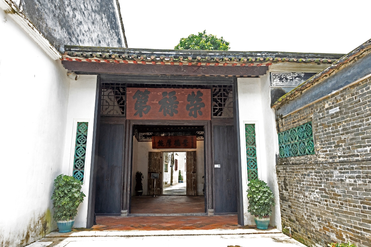 房屋間以水巷分隔,建築外牆檐壁均有灰塑浮雕裝飾,造法在嶺南建築常見,而牆基則由花崗石砌築而成,兩個主入口,都採用與宅門入口相同的凹斗式設計,即是自檐口往內凹,與外牆身不處在同一直線上,而為顯示其重要性,門框更以花崗石作材料,其中最重要的建築入口更以兩重花崗石門框設計。