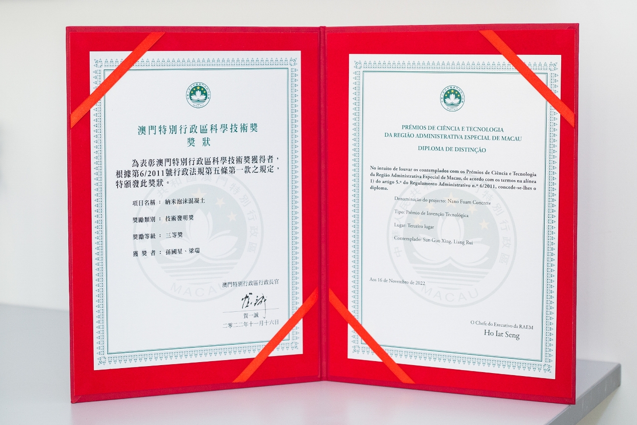 放眼四周,寫字樓、住宅、路橋……每項城市建設都離不開一種重要材料――混凝土。以往利用傳統混凝土施工,耗時又耗力,隨着環保「減碳」成發展趨勢,澳門大學應用物理及材料工程研究院孫國星副教授及團隊成員梁瑞博士,研發出一項革新的建築材料――「納米泡沫混凝土」,可有效減少碳排放量及降低成本。最近,該科研項目獲得「2022澳門科技獎」的「技術發明獎」三等獎。