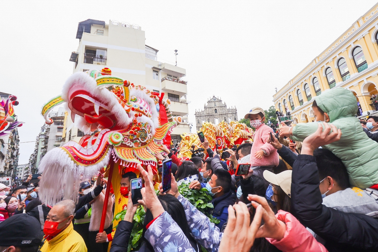 大年初一,寓意生龍活虎的238米大金龍,在瑞獅的伴隨下穿梭澳門多個地點,向觀眾呈獻龍獅表演。財神爺、金童玉女、福祿壽、兔生肖、澳門旅遊吉祥物「麥麥」等亦會在澳門各區出現,向遊人拜年及派發「金元寶」。