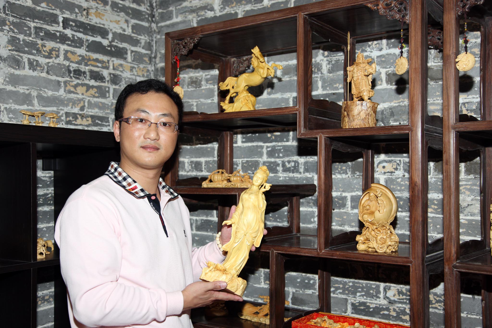 黃楊木雕是浙江省著名的“三雕”之一,以珍貴的黃楊木雕製,據來澳的工藝家高敏所稱,黃楊木質地堅韌,紋理細密,生長週期長達百年以上,故一件質素上佳的黃楊木雕作品價值不菲。樂清黃楊木雕屬於小型圓雕藝術,以人物題材為主要內容,造型生動,雕刻精巧,色澤明潤,深受收藏者喜愛。高敏是次帶來的多件黃楊木雕作品中,既有別緻生動的小型十二生肖作品,又有具收藏及欣賞價值的佛像及人像雕刻,作品結合了現代雕塑手法與傳統黃楊木雕技法。高敏出生於工藝美術世家,隨父親中國工藝美術大師高公博學藝,現任樂清市文化館非物質文化遺產保護中心副主任、浙江省根藝美術學會常務理事,先後榮獲浙江省多個青年藝術家獎項,曾多次赴各地演出。