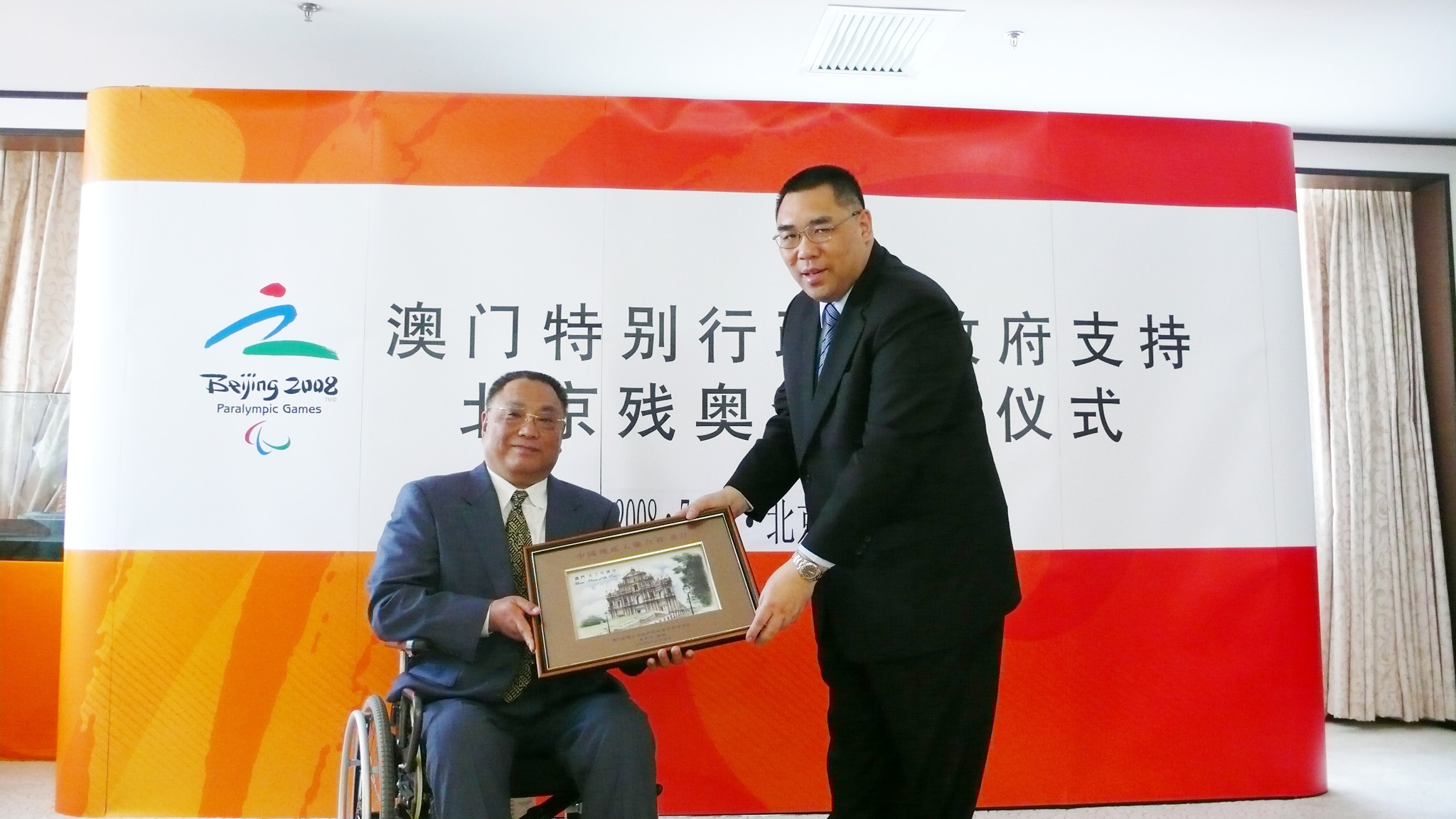 北京殘奧會將繼北京奧運會後,於9月6日至17日在我國首都北京隆重舉行,全國人民及澳門市民帶著興奮的心情期待運動會的到來。“兩個奧運、同時籌辦、同樣精彩”,為此,澳門特別行政區政府特向北京奧組委捐贈人民幣一千萬元,作為支持國家籌辦北京2008殘奧會開閉幕式及殘奧會宣傳文化活動,以及向中國殘疾人聯合會捐贈人民幣五百萬元,作為支持中國殘奧代表團參賽的部份經費。
