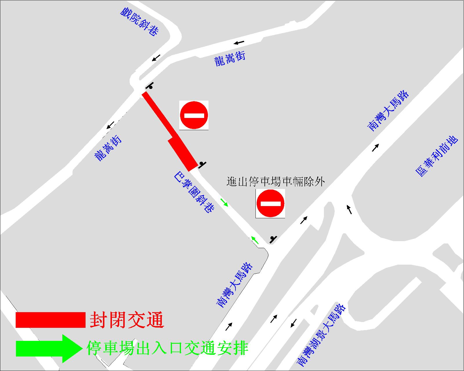 民政總署明起於巴掌圍斜巷一段道路進行第三階段下水道接駁工程。為配合施工,當日上午十一時起,介乎嘉華閣與龍嵩正街之間的一段巴掌圍斜巷,以及介乎南灣大馬路與永利大廈之間的一段巴掌圍斜巷將臨時封閉,除後者准許進出停車場之車輛通行,其餘車輛一律禁止通行及泊車。上述交通改動為期20日,待工程完成後,將恢復原來的行車運作。