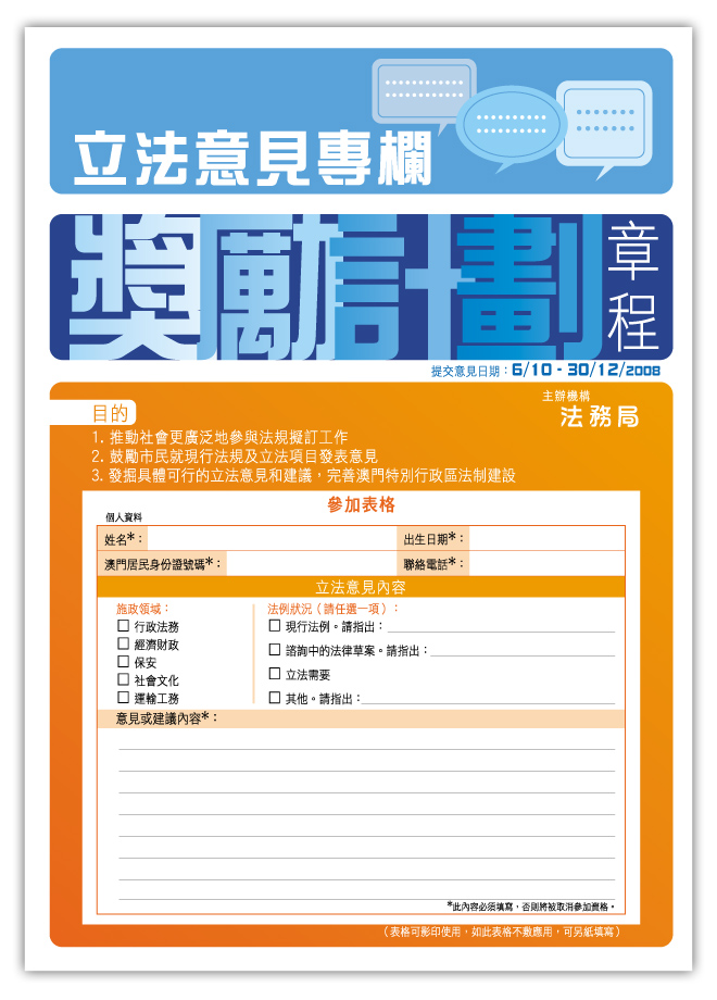 為推動社會更廣泛地參與法規擬訂工作、鼓勵市民就現行法規及立法項目發表意見,以及發掘具體可行的立法意見和建議,完善澳門特別行政區法制建設,法務局將舉辦“立法意見專欄獎勵計劃”,歡迎年滿十六歲,且持有效澳門居民身份證的居民參加。