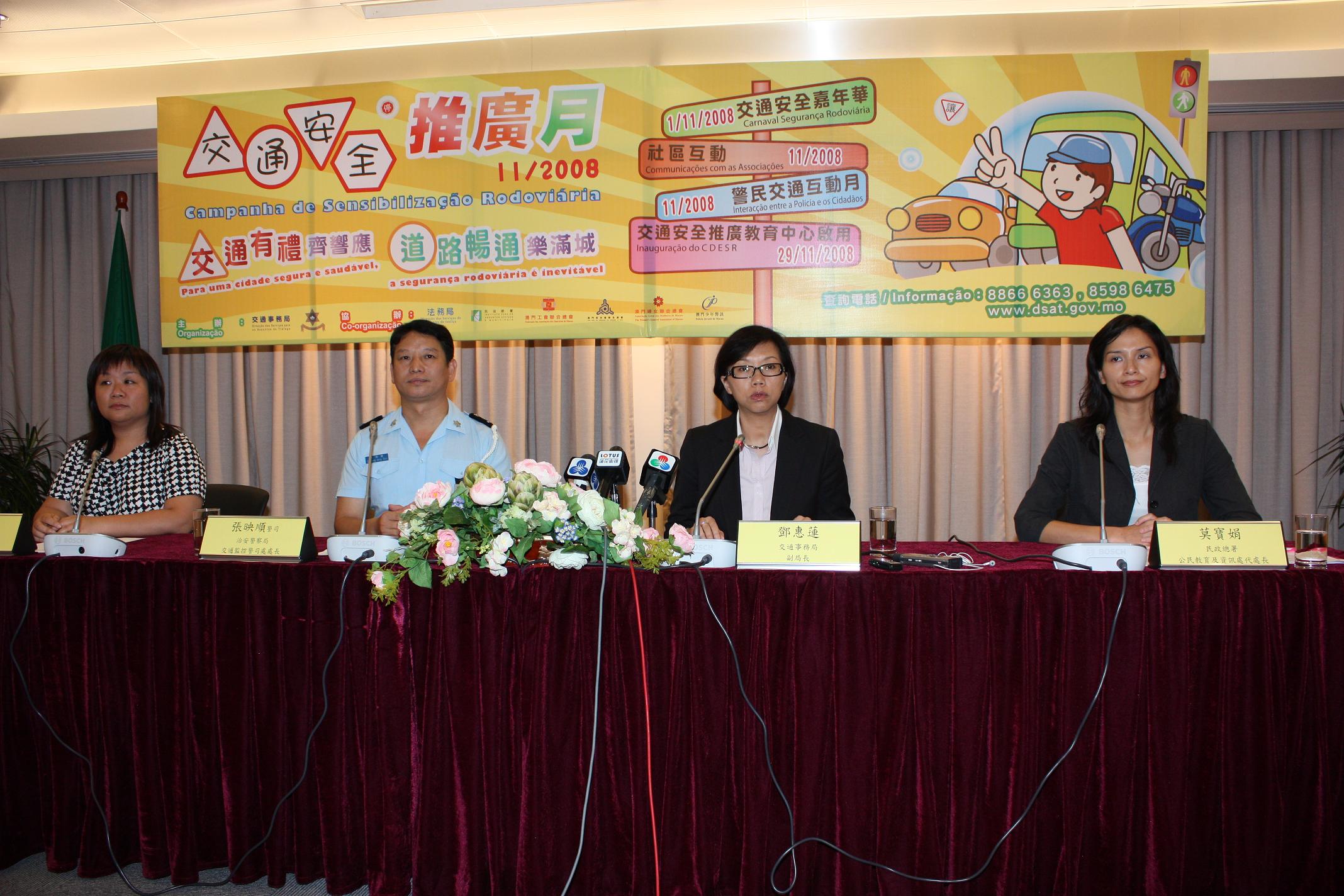 “交通安全推廣月”記者招待會今日(30日)下午三時半於交通事務局多功能廳舉行,交通事務局副局長鄧惠蓮、治安警察局交通監控警司處處長張映順警司、法務局法律推廣廳代廳長羅靜萍及民政總署公民教育及資訊處代處長莫寶娟出席介紹活動詳情。