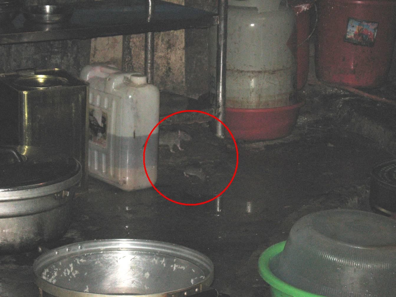 黑沙環社區衛生工作組在進行<酒店同類場所及食品製作工業場所>常規巡查時, 發現一所設於台山何賢紳士大馬路一間鐵皮屋內的食物製造工場, 製作“外賣”食物予工廠及地盤工人。該場所環境衛生條件極差, 在巡查期間, 一作小組人員在現場目睹動物病媒四隻老鼠安靜地在進食。除此之外, 還發現廚房使用的破爛工具和包裝用品, 而且, 還有多條由老鼠築成通往工場的“鼠路”。