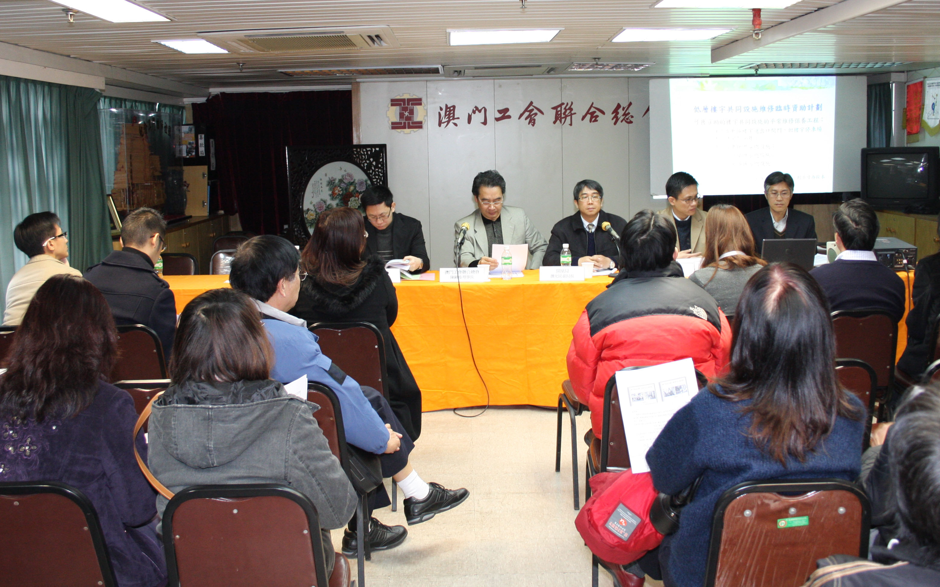 為協助居民處理樓宇塞渠滲漏的問題,以及改善樓齡30年或以上的低層樓宇進行共同部分保養的工作,政府將設立《樓宇滲漏水聯合處理中心》及推出《低層樓宇共同設施臨時資助計劃》,以改善居民居住環境,提升生活素質。房屋局於1月12日至16日聯同土地工務運輸局、民政總署、衞生局及法務局等多個政府部門先後與澳門工會聯合總會、澳門明愛及澳門街坊會聯合總會合辦《樓宇滲漏水聯合處理中心》及《低層樓宇共同設施臨時資助計劃》說明會,向社團及居民作出詳細說明,參加人數合共約一百六十多人,與會者踴躍發問,反應熱烈。