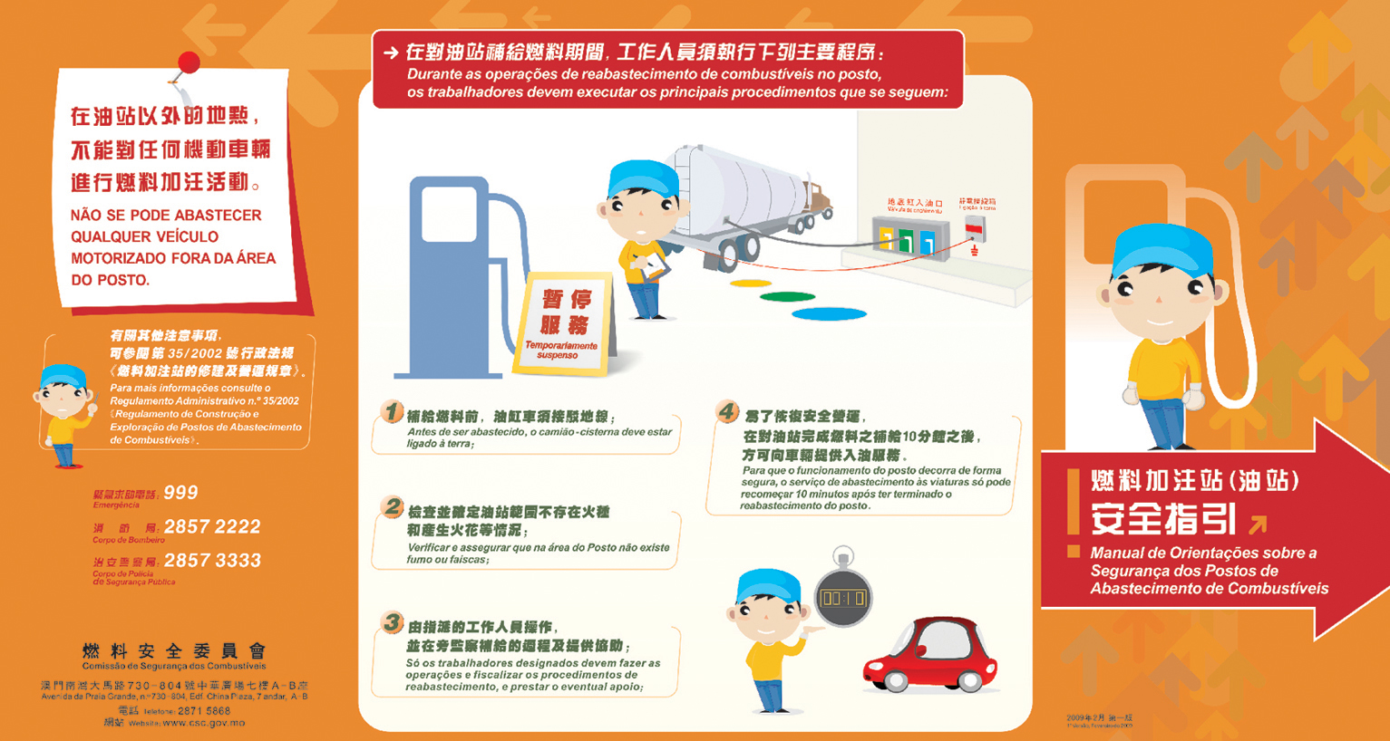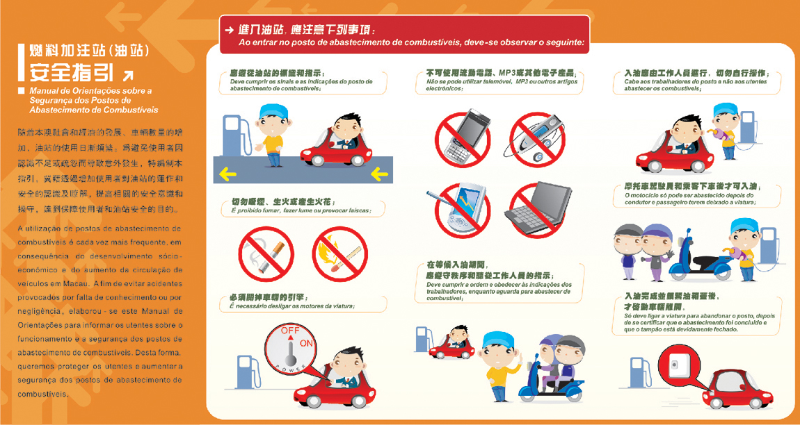 隨着本澳社會和經濟的發展,車輛數量的增加,油站的使用日漸頻繁,已與市民生活息息相關,為避免使用者因認識不足或疏忽而導致意外發生,燃料安全委員會特印製《燃料加注站(油站)安全指引》宣傳單張及海報,冀藉透過增加使用者對油站的運作和安全的認識和瞭解,提高相關的安全意識和操守,減免意外的發生。