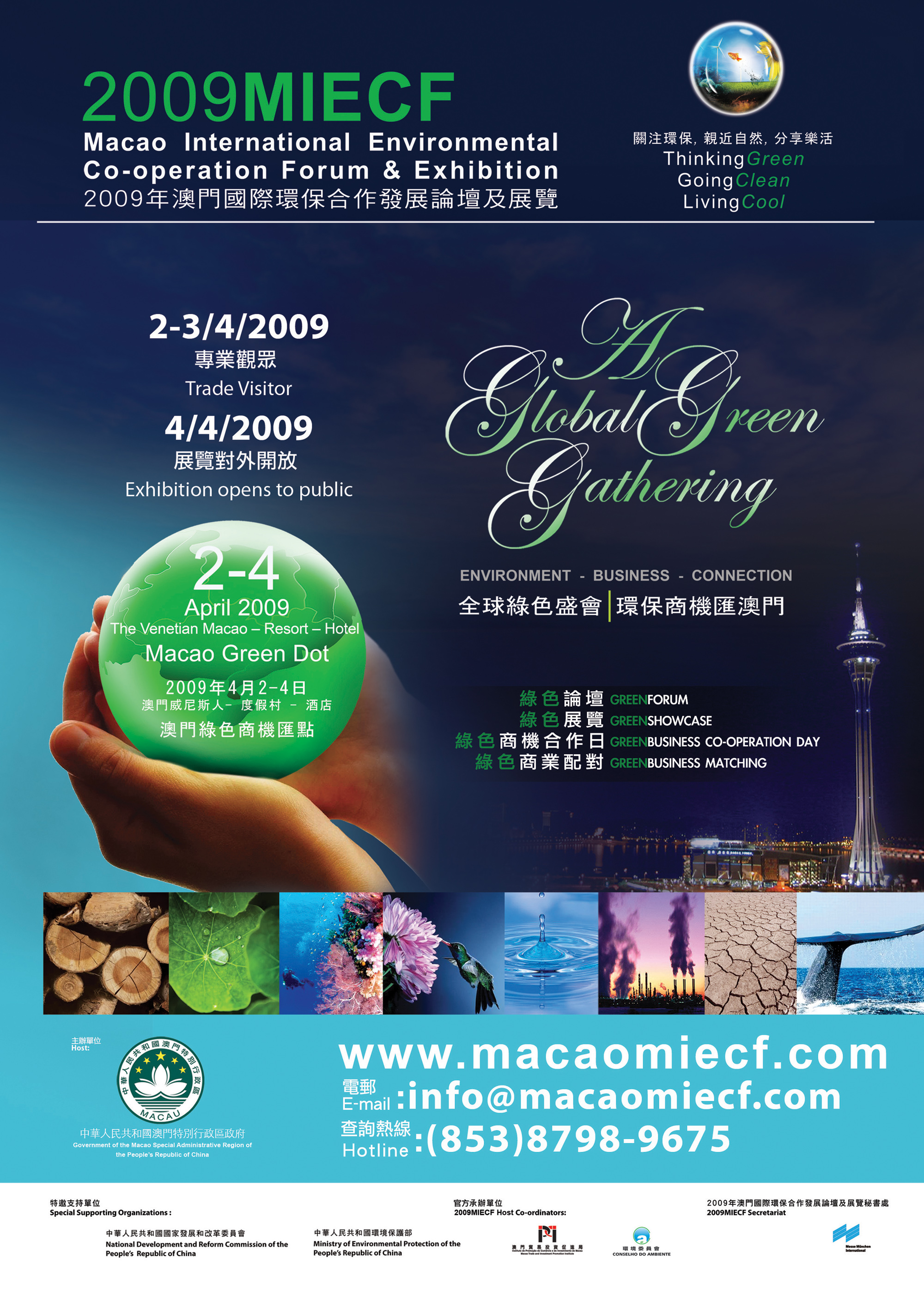 2009MIECF由澳門特別行政區政府主辦、澳門貿易投資促進局及環境委員會承辦,場地總面積超過12,330平方米。活動雲集世界頂尖的環保官員、專家及學者,共同探討最新的環保議題,同時展覽會吸引中國內地及歐美等地商人來澳參展,尋求環保商機。現時各地組織來澳門參展及參會代表團已達230個,代表人數超過1,400。