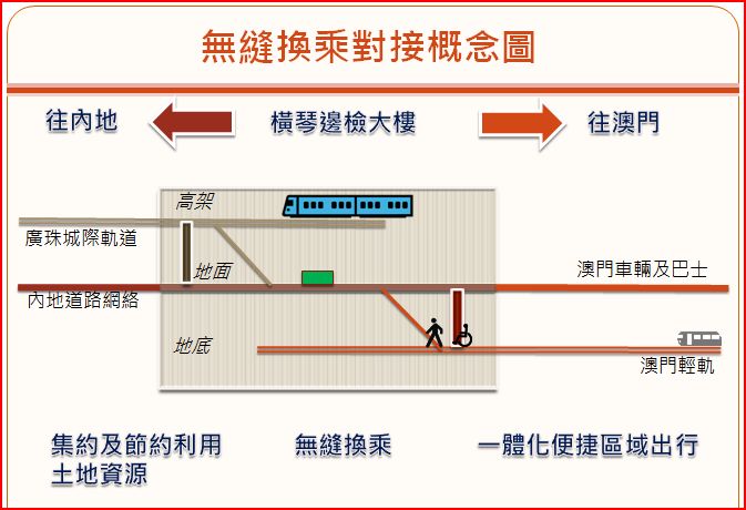 在一個綜合過境設施內,廣珠城際軌道與澳門輕軌能夠進行共點但不共層的垂直無縫對接。譬如澳門輕軌的乘客在設施的地底層藉便捷的手扶電梯或升降機,到達地面層的通關設施,再使用升降機或手扶電梯到達最上層的廣珠城際軌道站台,換乘廣珠城軌列車來往廣州及沿線地區,以有效縮短乘客換乘系統的時間及步行距離。