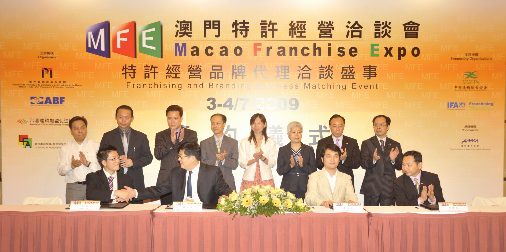 為期兩天的首屆「澳門特許經營洽談會」(MFE)今天(7月4日)圓滿閉幕,是日展覽全面對外開放,讓中小企及公眾共同參與此盛會。MFE兩天入場人次超過4800人。商業配對洽談共883場,現場安排項目簽約共16份,內容涉及服裝品牌、小熊屋餐廳及環保節能產品特許經營,芒果酒、燈飾、礦泉水、消防設備、休閒鞋、白酒及環保地板代理銷售,設立食品科技研究及銷售,成立籌委會,開展環保產品專案等,簽約方來自中國、澳門、香港、台灣、葡萄牙、韓國及菲律賓,涉及金額超過澳門幣1億。共舉行了9場專業推介洽談會及1場研討會,入場人數超過400人。