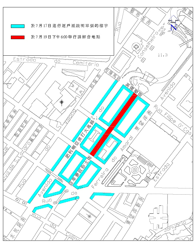 同時,更於今天(十七日)派出專業技術人員向荷蘭園大馬路、荷蘭園二馬路、東望洋街、約翰亞美打街、西墳馬路、巴冷登街等街道的住戶及商號派發宣傳單張、問卷,及即時講解,以便廣泛地收集該區居民意見。除向住宅和商號派發宣傳單張及問卷外,亦計劃於十九日(周日)下午六時於荷蘭園二馬路舉行諮詢會,實地講解優化方案,歡迎附近街坊、商號、社會各界人士出席,踴躍發表意見。