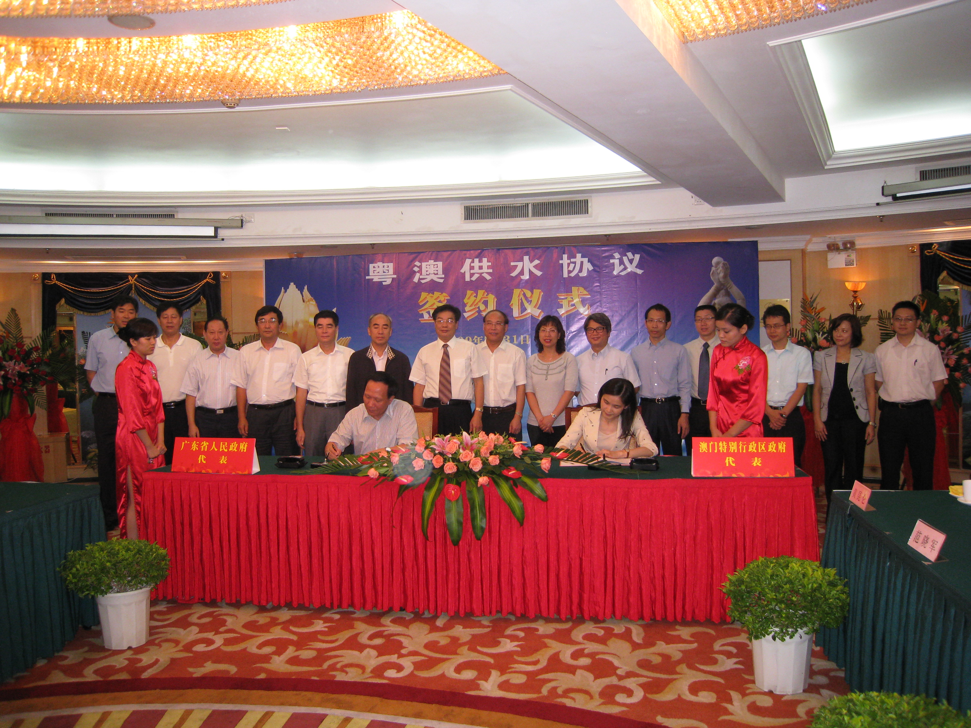 簽署協議的澳方代表為粵澳供水專責小組澳方組長、港務局局長黃穗文,粵方代表為廣東省水利廳廳長黃柏青。出席簽署儀式的澳方人員包括運輸工務司司長辦公室、港務局以及澳門自來水股份有限公司的代表;粵方出席人員包括廣東省水利廳、珠海市政府的官員以及珠海市水務局和供水總公司代表。