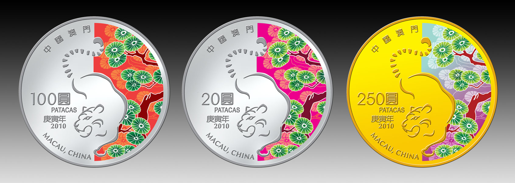 澳門金融管理局於2008年推出全新系列之農曆年紀念幣,虎年紀念幣為系列的第三套紀念幣。秉承系列特色,同時發行一枚重7.776克的精裝金幣、一枚重31.1克的精裝銀幣及一枚重5安士的精裝銀幣。三款紀念幣之設計圖案相同,但色調不一。
