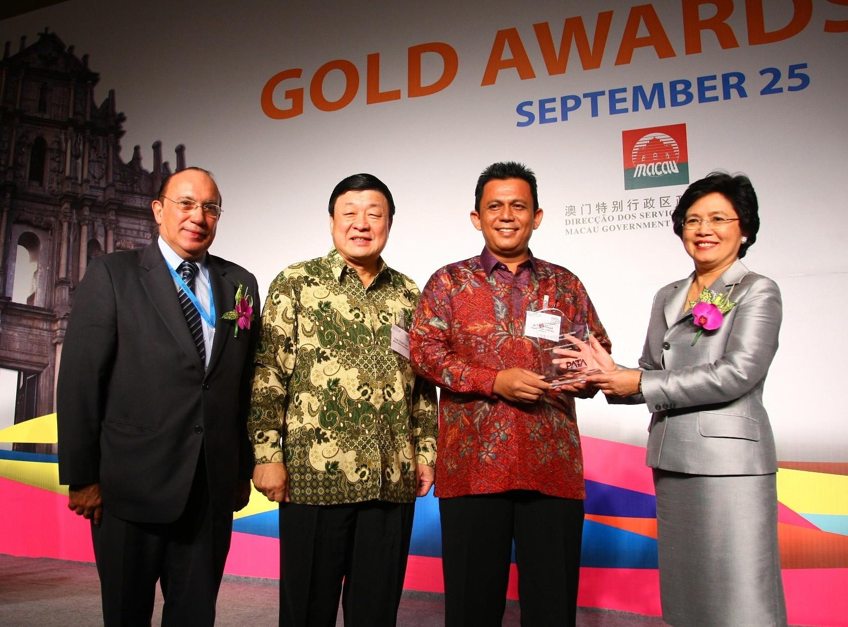 亞太旅遊協會行政委員會主席Phornsiri Manoharn、中國國家旅遊局局長邵琪偉、旅遊局局長安棟樑等嘉賓出席了亞太旅遊協會金獎午宴。午宴上亞太旅遊協會特別向中國國家旅遊局局長邵琪偉頒發亞太旅遊協會傑出貢獻獎,以表揚他作為中國國家旅遊局領導,對中國旅遊發展所作出的貢獻。協會亦頒發了本年度的四個金獎大獎和二十三個金獎。當中,旅遊局的“感受澳門”宣傳短片獲得了旅遊推廣短片的榮譽獎。