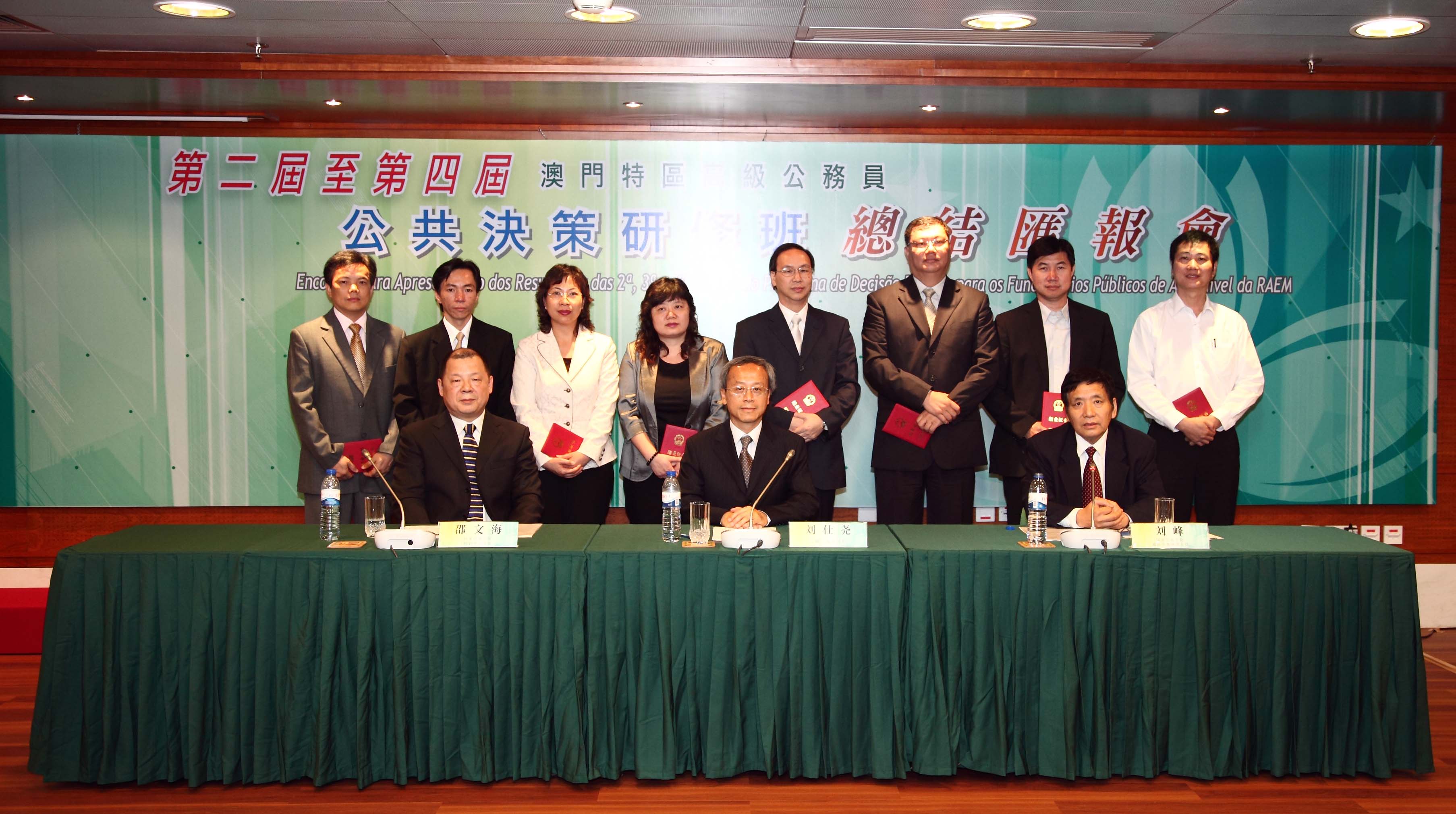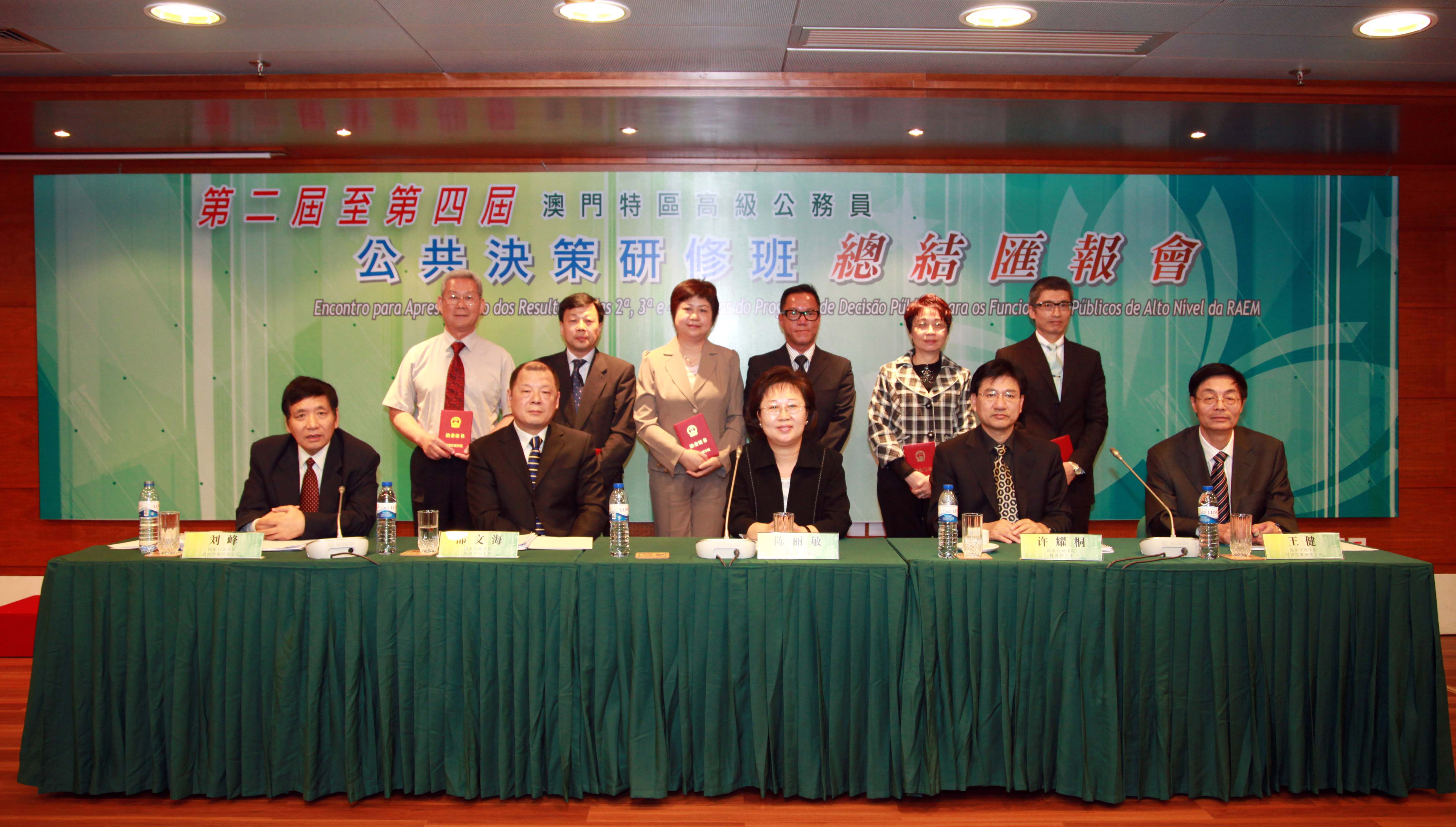 “總結匯報會”在公共行政大樓多功能廳舉行。參與課程的領導級官員根據所研究的課題範疇分為八個小組,分別向相關範疇的司長匯報學習成果。行政法務司陳麗敏司長、保安司張國華司長、運輸工務司劉仕堯司長,以及國家行政學院的領導聽取了學員匯報。八個小組的課題分別為 “設立公共工程承建商中央資料庫”、“構建中央交通資料庫系統”、“社區警務”、“優化海上運輸突發公共事件危機管理”、“電子政務E-PASS”、“特區政府的公民教育政策”、“人口政策—協助內地新移民融入社會計劃”及“構建澳門世界遺産跨部門推廣協調機制”。