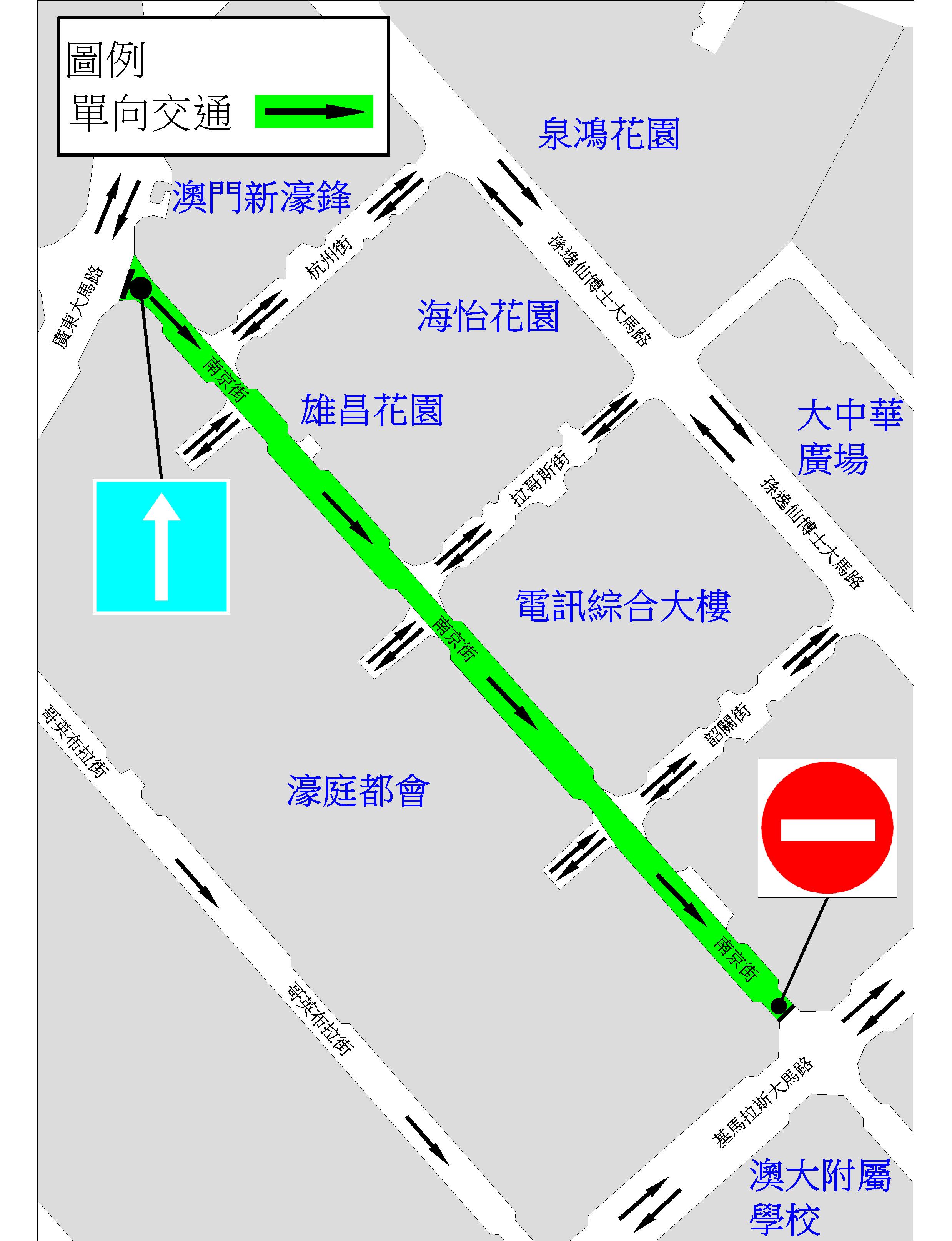 配合民政總署的重鋪路面工程,介乎廣東大馬路與基馬拉斯大馬路之間的一段氹仔南京街,將於7日(周一)上午11時起臨時改作單向行車,直至本月15日。期間,車輛需要由廣東大馬路往基馬拉斯大馬路方向行駛,同時,南京街部分咪錶泊車位及電單車泊車位亦將禁止車輛停泊。