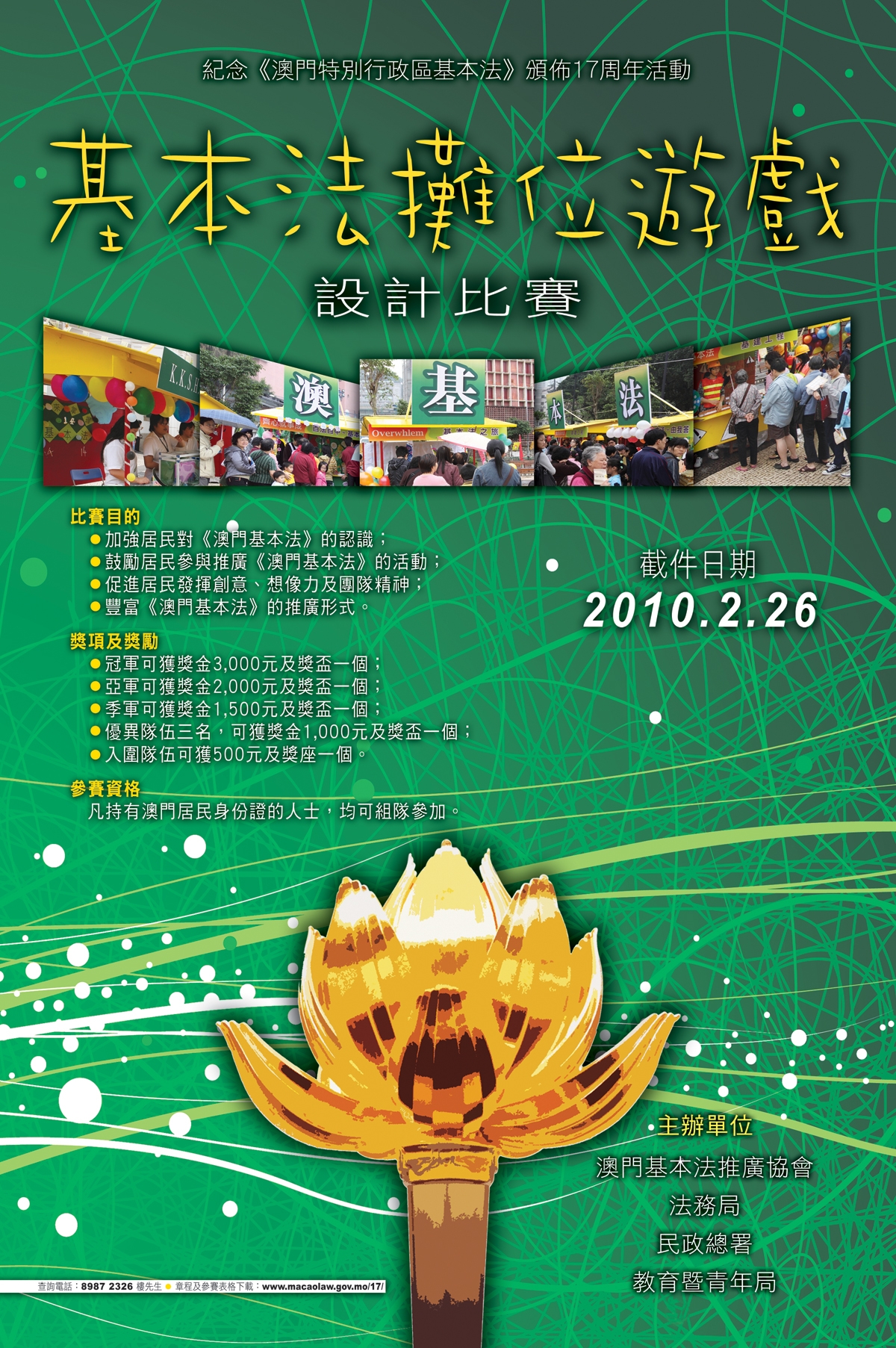 為紀念《澳門特別行政區基本法》頒佈十七周年,澳門基本法推廣協會、法務局、民政總署及教育暨青年局共同合辦一系列的慶祝活動,而其中的“基本法攤位遊戲設計比賽”將於本月二十六日下午五時半截止報名,有意組隊參加的本澳市民請把握最後四天的報名機會。