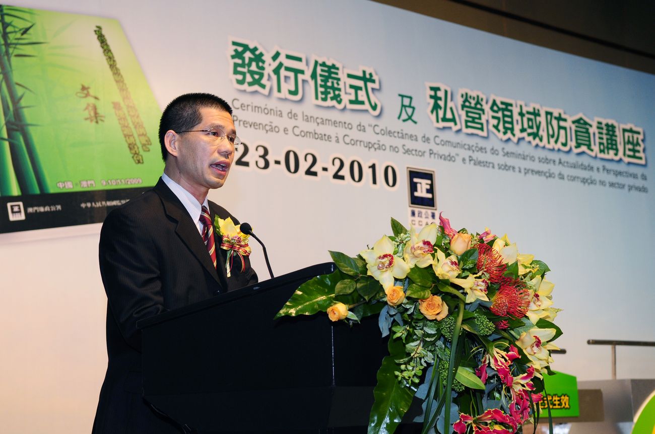行政長官崔世安致辭表示,2009年立法會通過《預防及遏止私營部門賄賂》法律,說明了預防和遏止私營部門賄賂已成為社會共識。他非常認同廉政公署展開全方位宣傳,協助不同行業制定誠信管理規則,聯合行業團體、傳媒和公民社會的力量,共建防貪網絡的策略。特區政府會大力配合廉政公署的工作,推動本澳企業誠信管理,共建廉潔公平的營商環境。